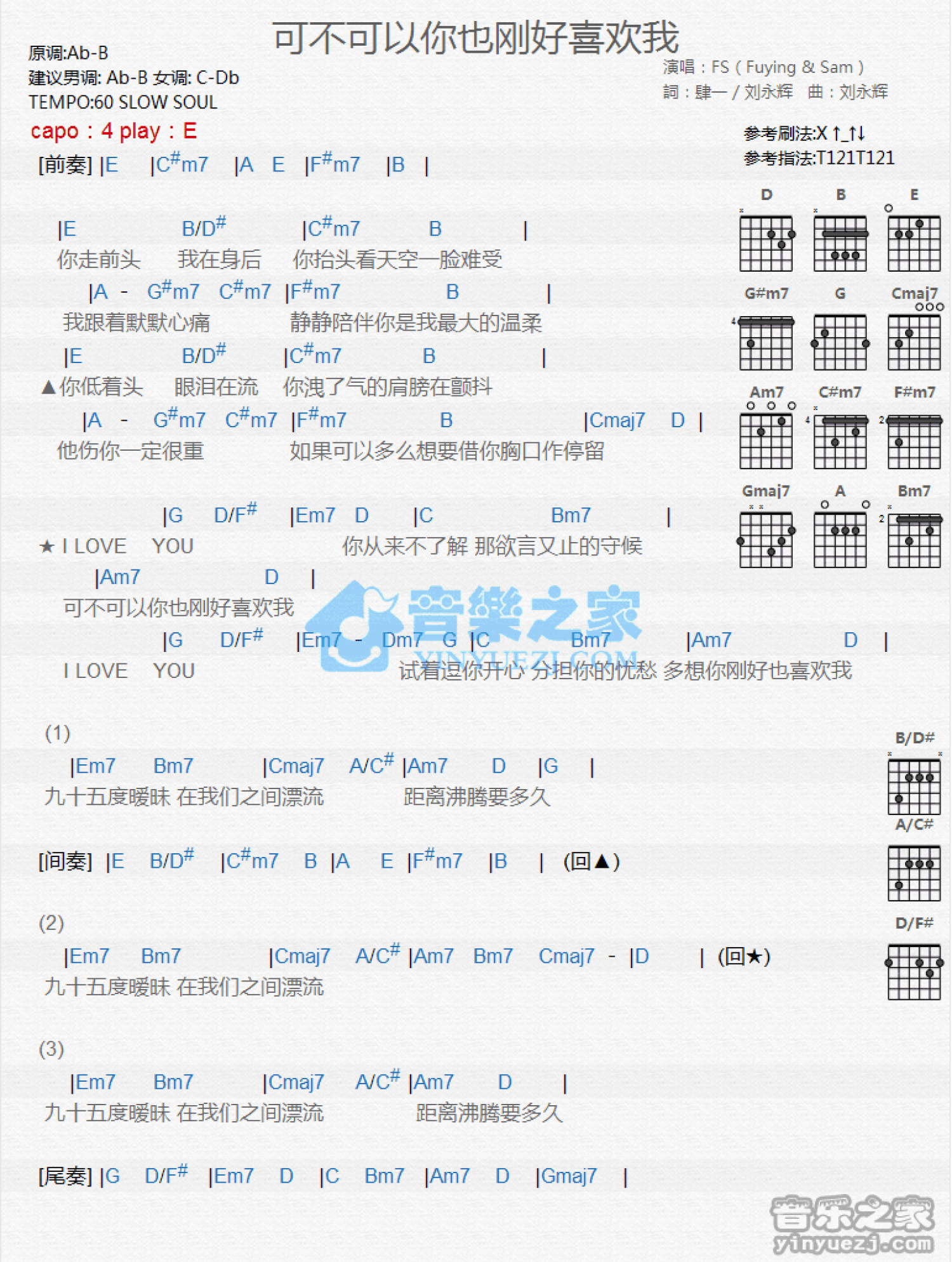 曲谱介绍: E调版FS《可不可以你也刚好喜欢我》吉他和弦弹唱谱