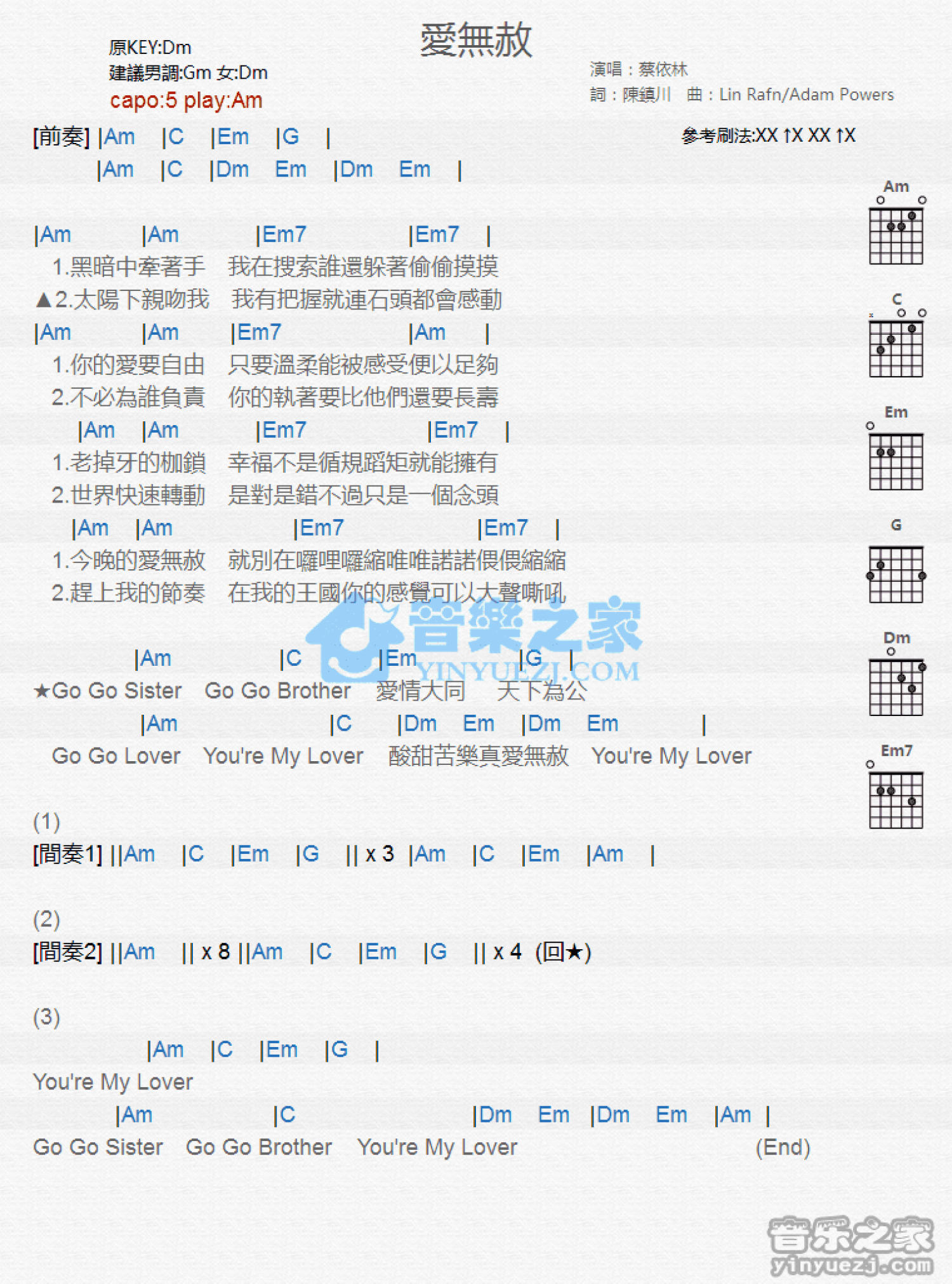 曲谱介绍: Am调版蔡依林《爱无赦》吉他和弦弹唱谱