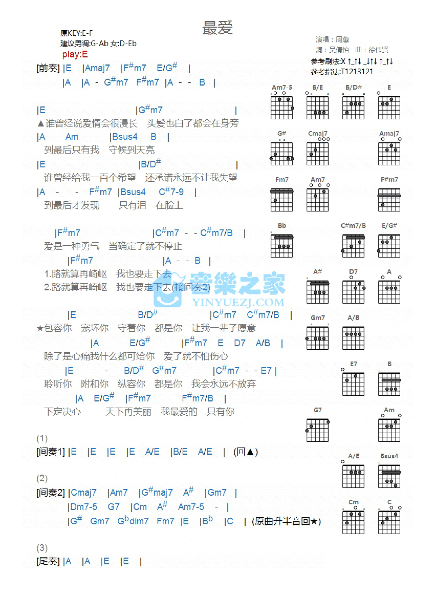曲谱介绍: E调版周惠《最爱》吉他和弦弹唱谱