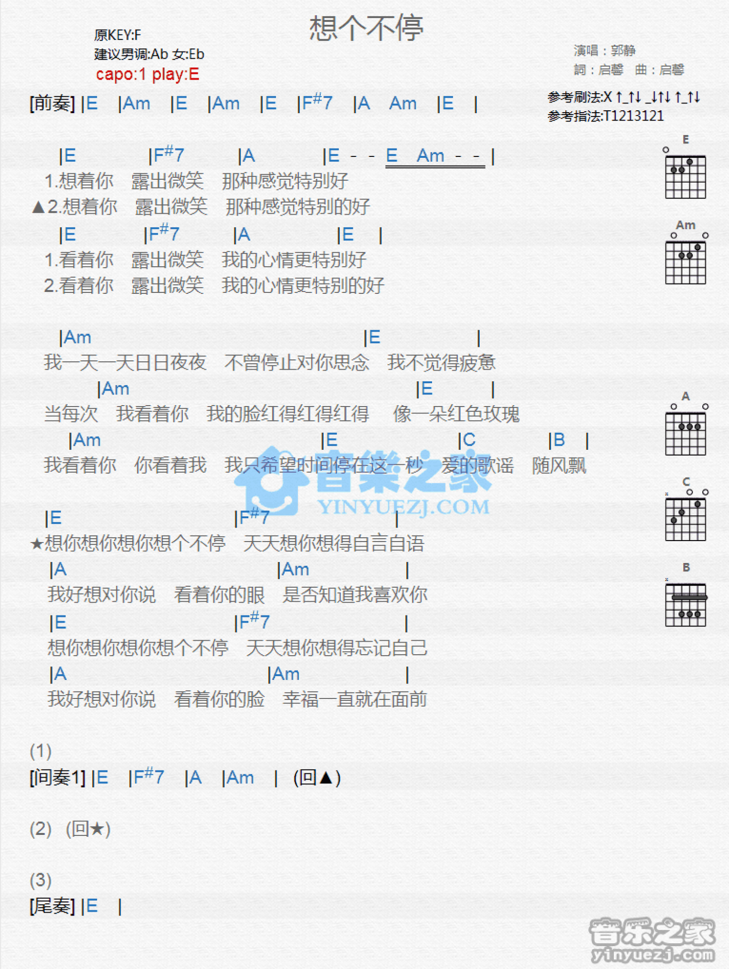 曲谱介绍: E调版郭静《想个不停》吉他和弦弹唱谱