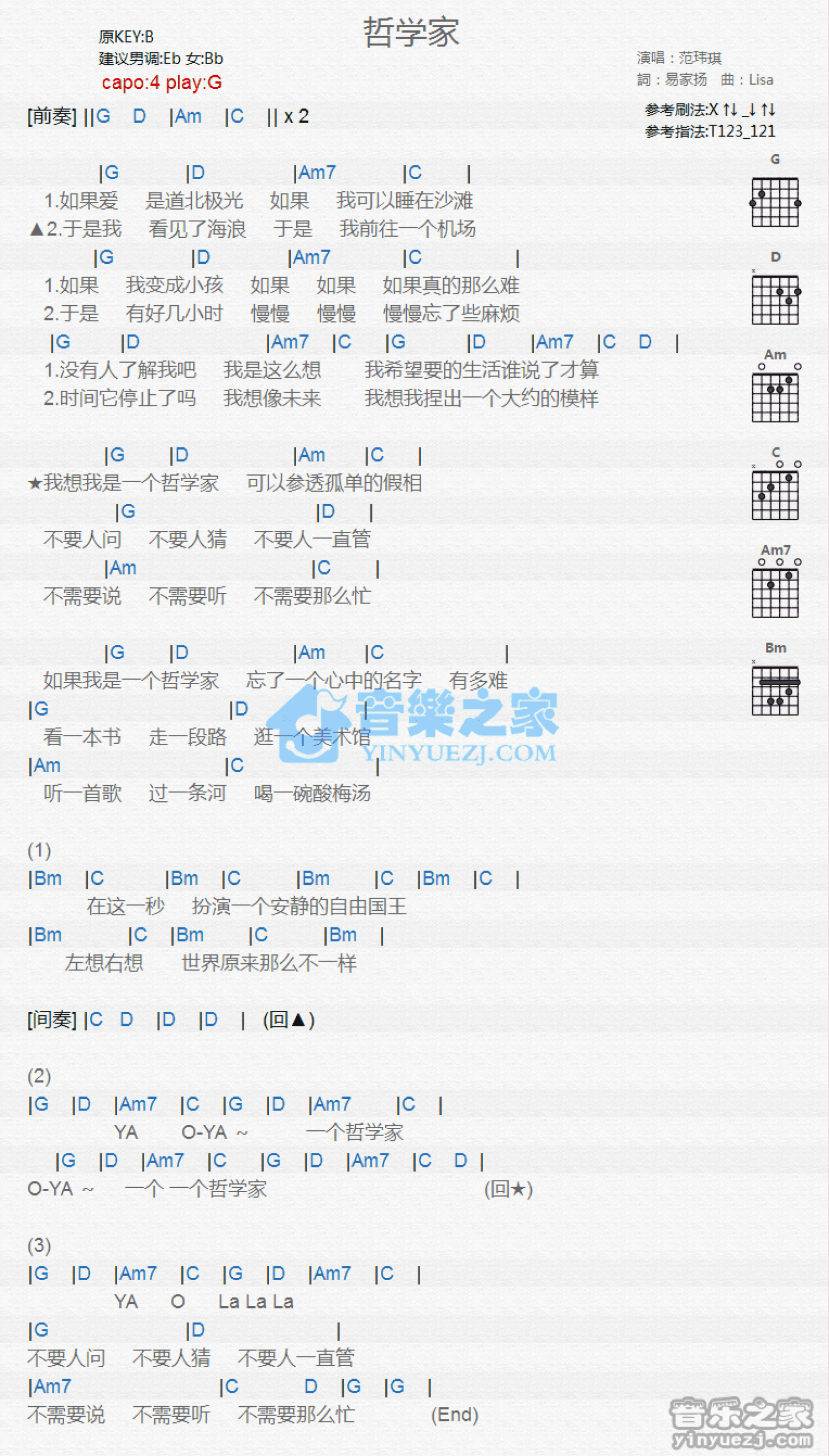 曲谱介绍: G调版范玮琪《哲学家》吉他和弦弹唱谱