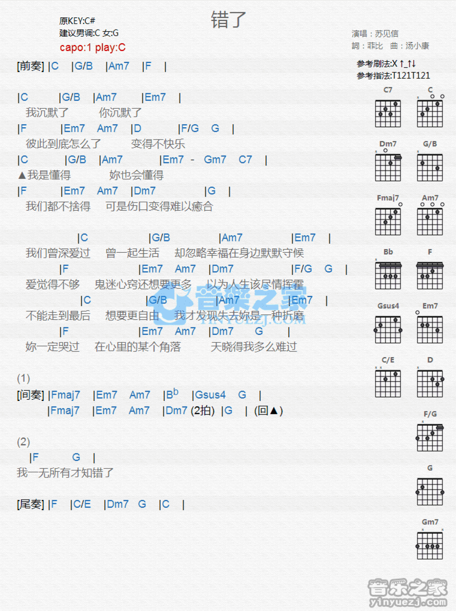 曲谱介绍: C调版苏见信《错了》吉他和弦弹唱谱
