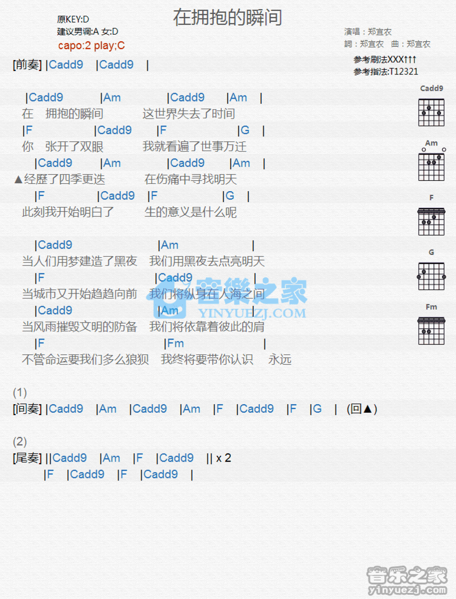 曲谱介绍: C调版《在拥抱的瞬间》吉他和弦弹唱谱