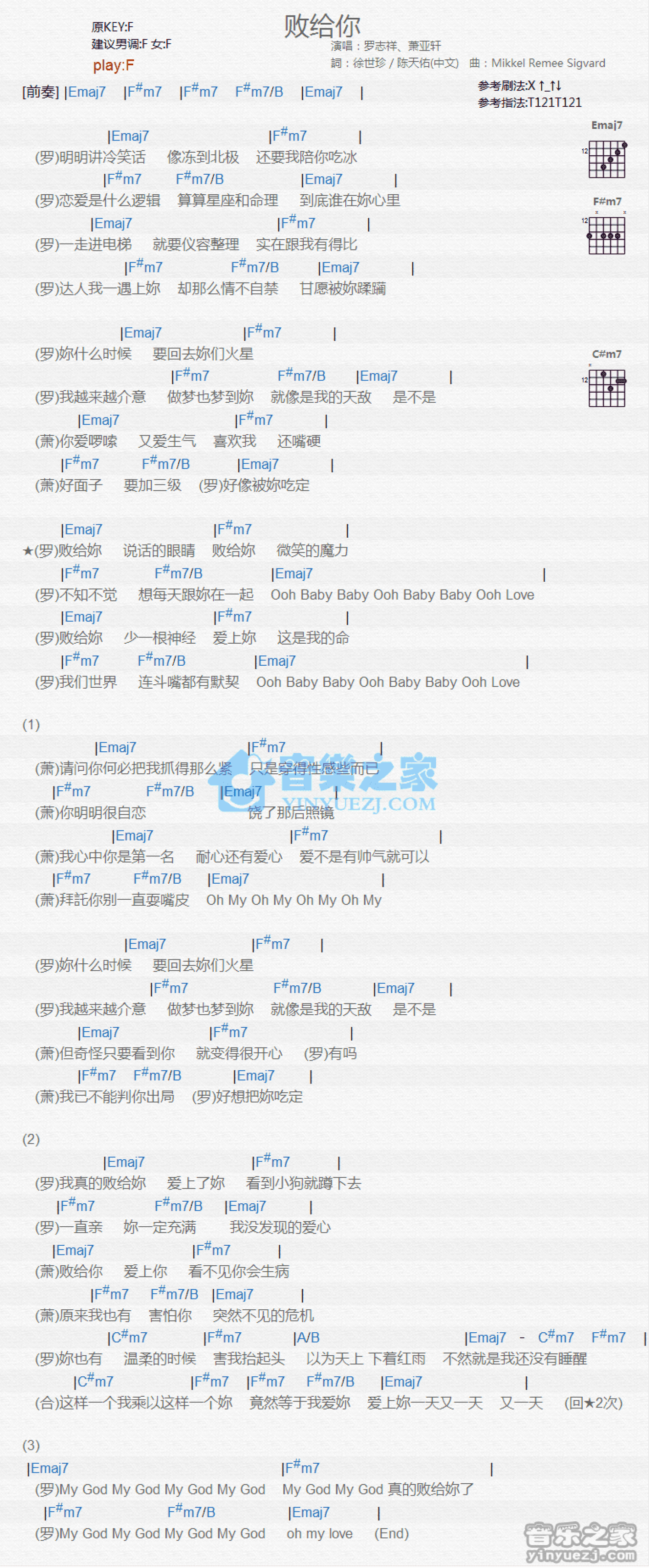 曲谱介绍: F调版罗志祥/萧亚轩《败给你》吉他和弦弹唱谱