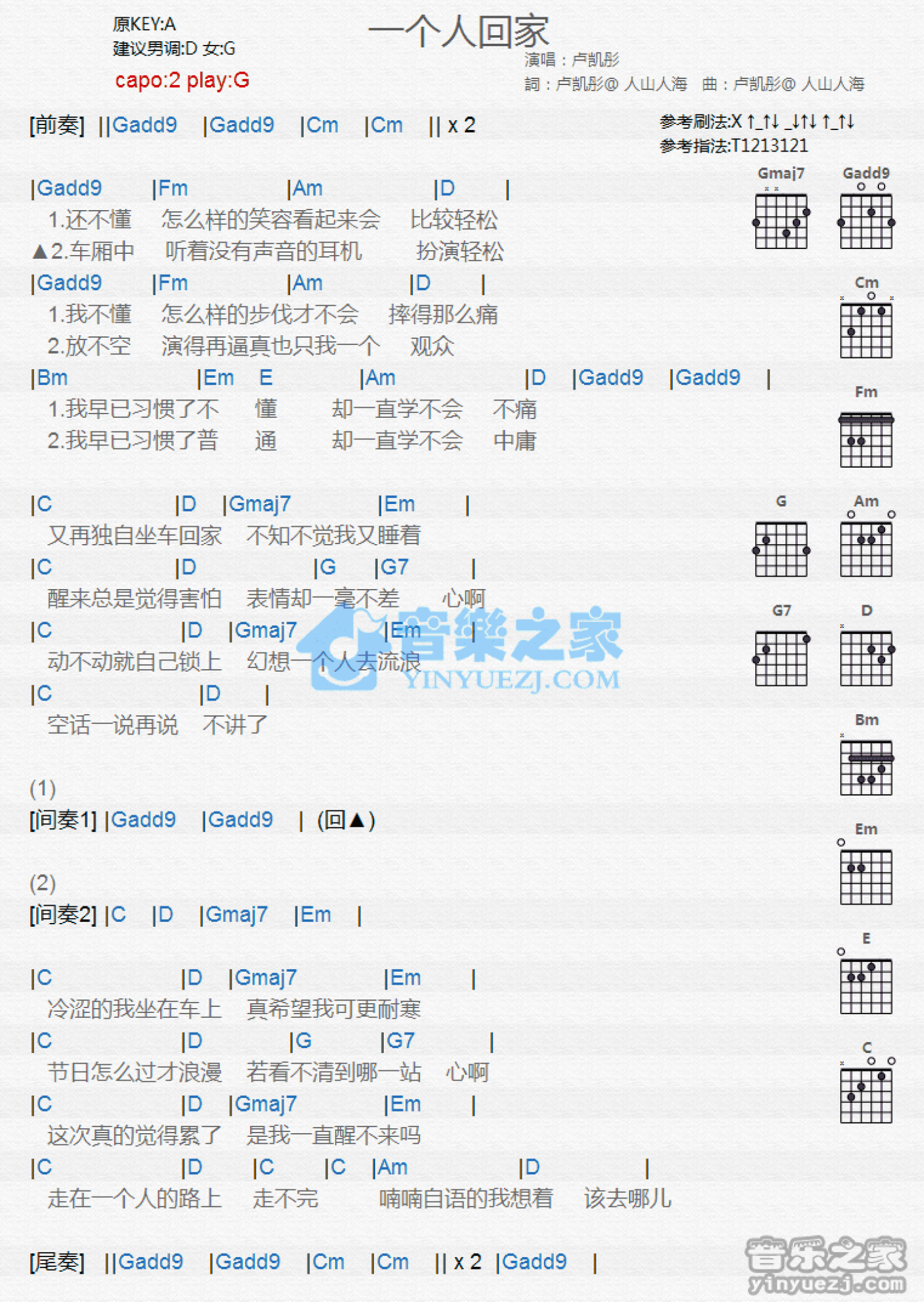 曲谱介绍: G调版卢凯彤《一个人回家》吉他和弦弹唱谱