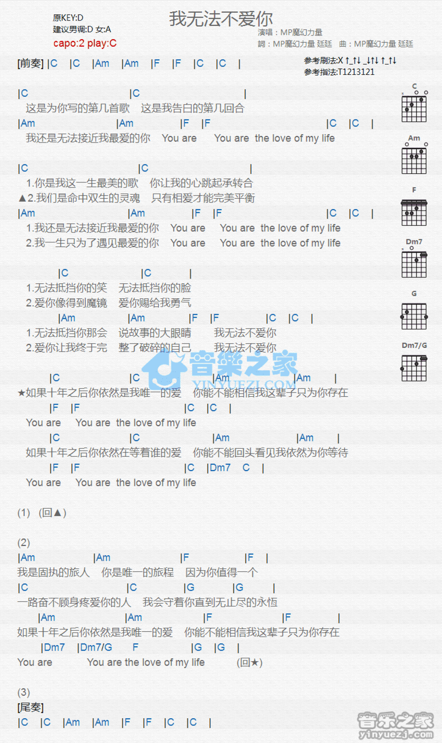 曲谱介绍: C调版MP魔幻力量《我无法不爱你》吉他和弦弹唱谱