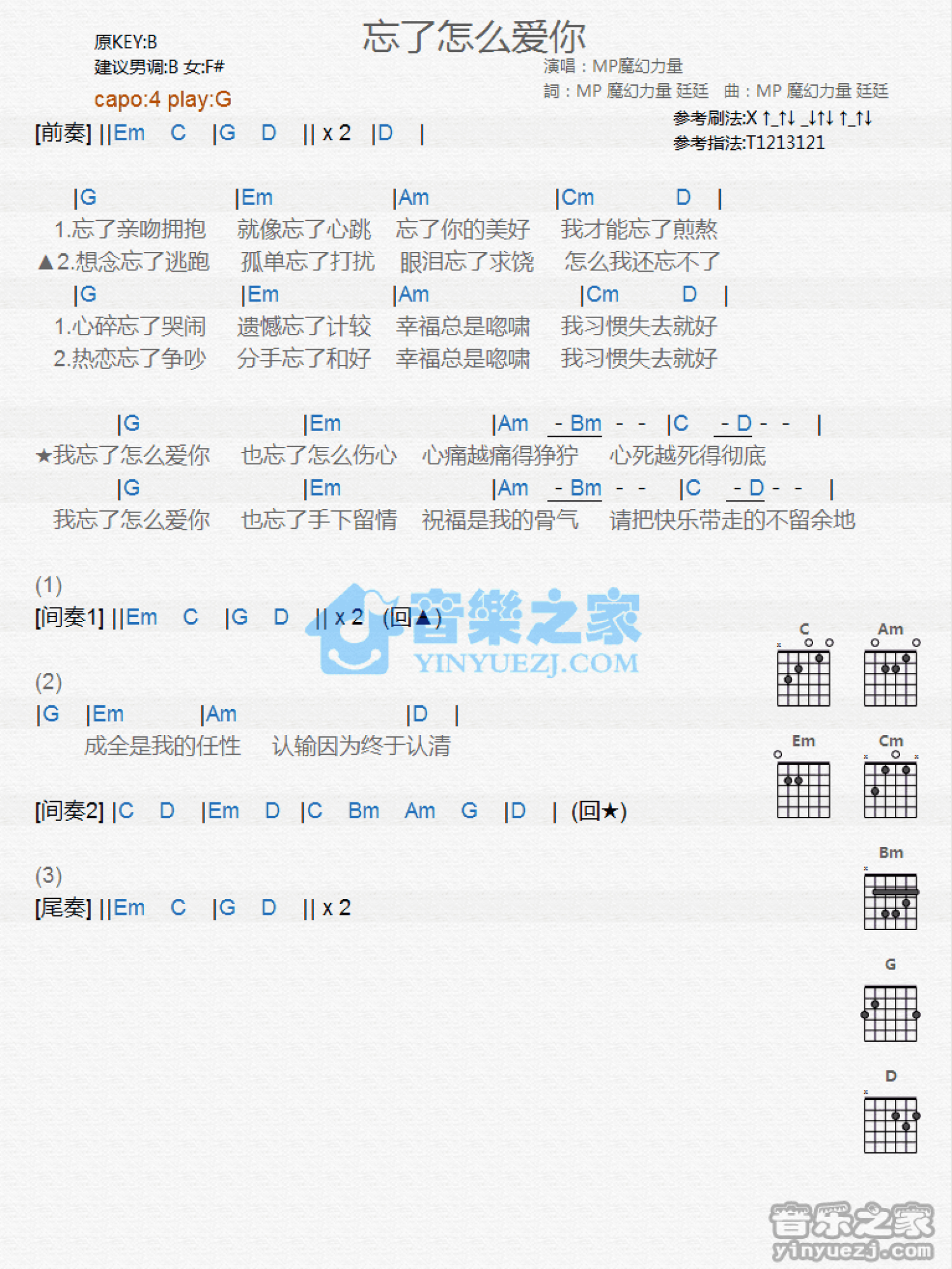 曲谱介绍: G调版MP魔幻力量《忘了怎么爱你》吉他和弦弹唱谱