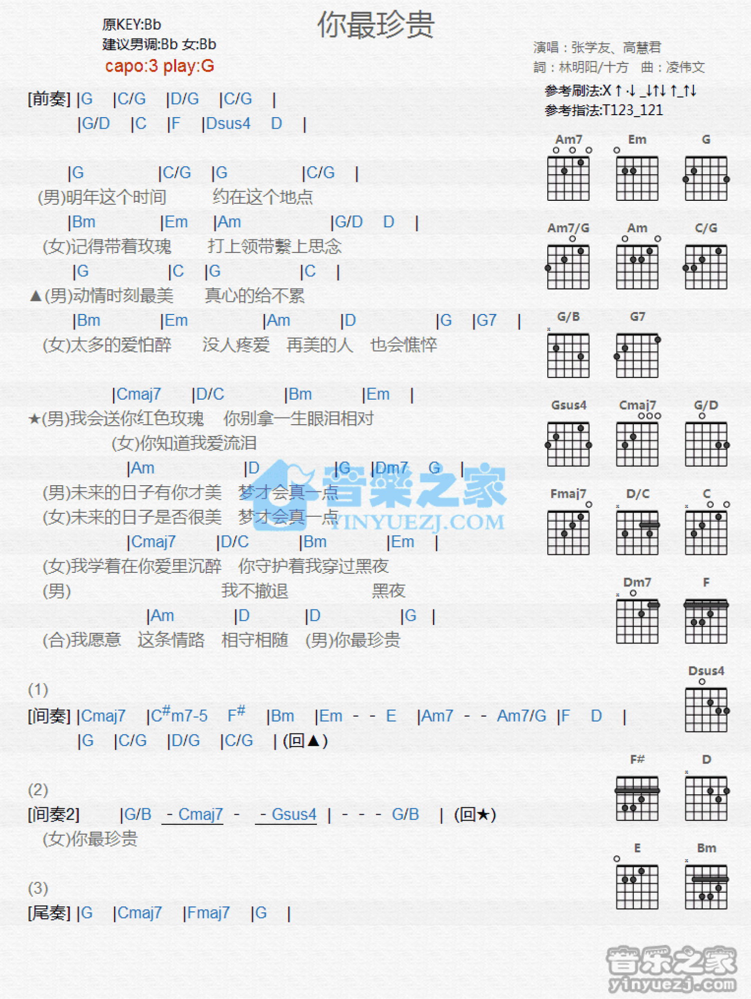 曲谱介绍: G调版张学友/高慧君《你最珍贵》吉他和弦弹唱谱