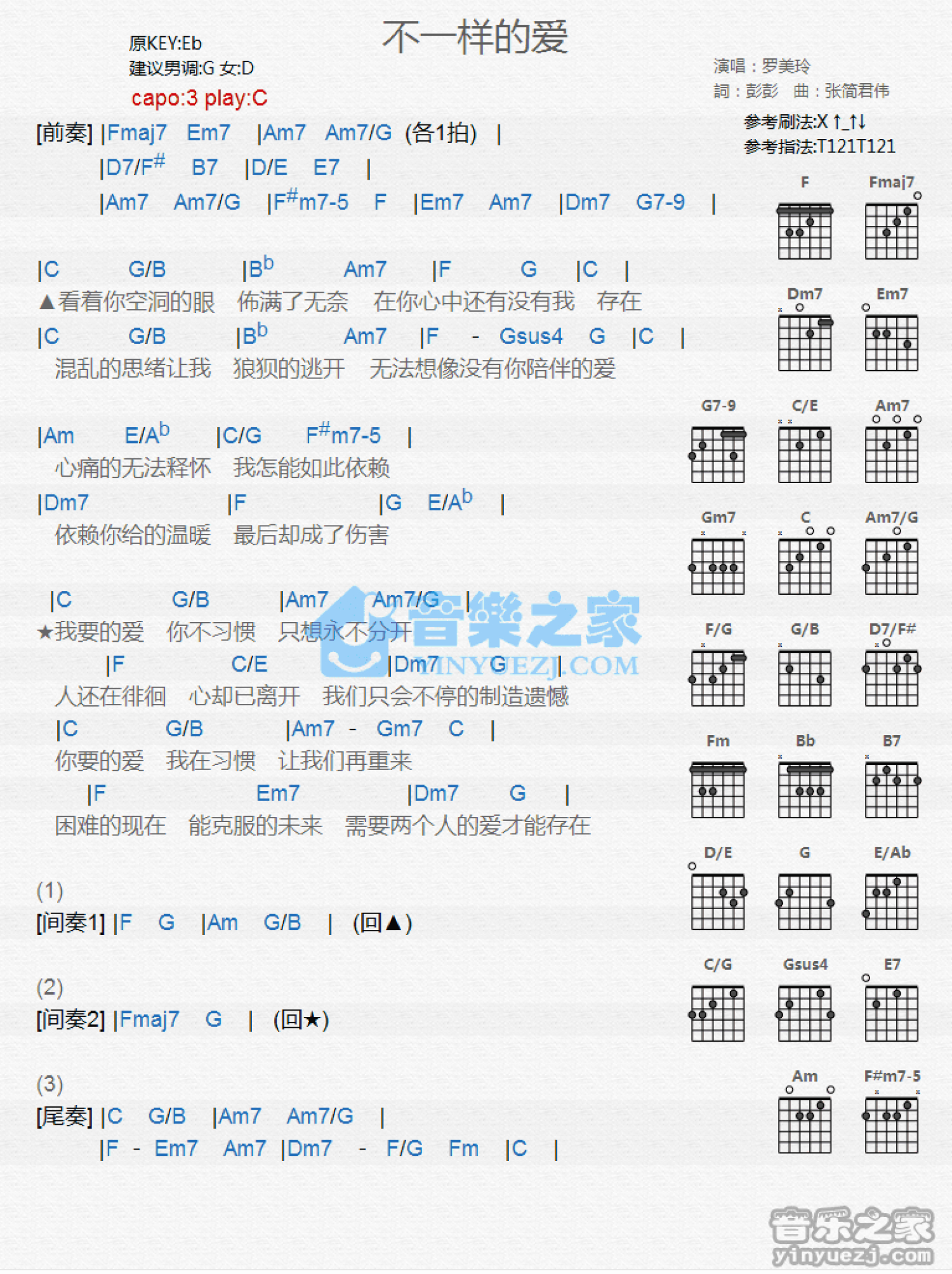 曲谱介绍: C调版罗美玲《不一样的爱》吉他和弦弹唱谱