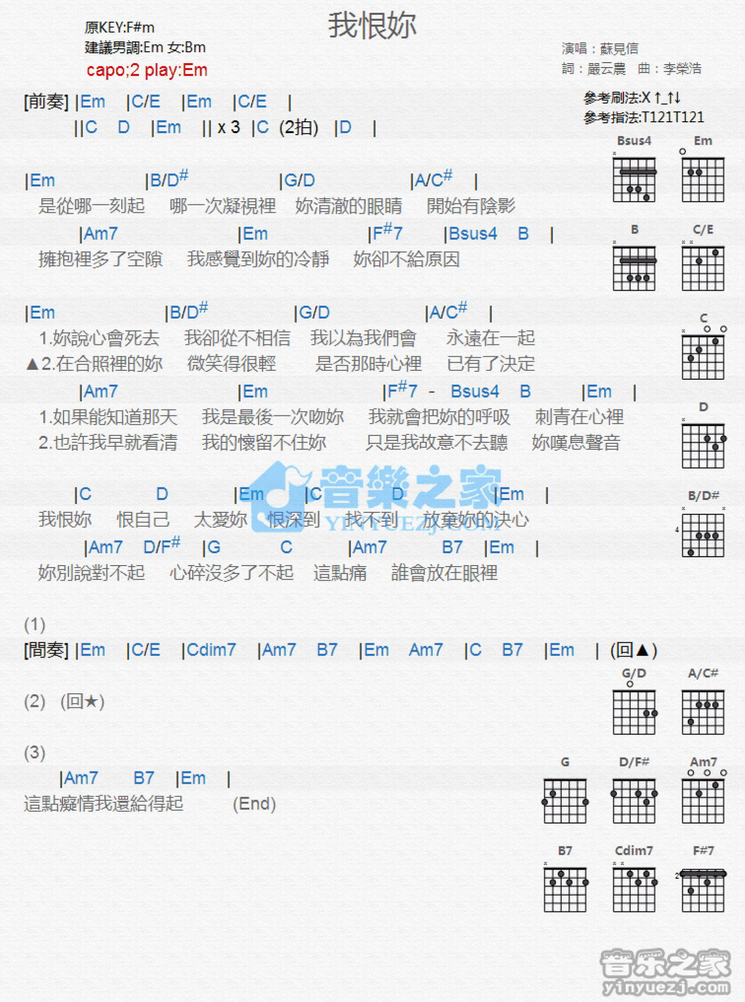 曲谱介绍: Em调版苏见信《我恨你》吉他和弦弹唱谱