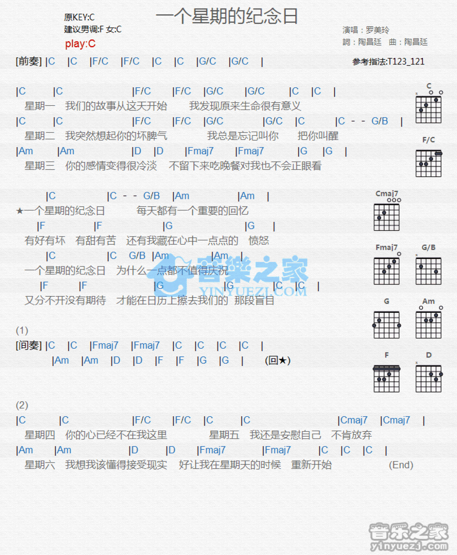 曲谱介绍: C调版罗美玲《一个星期的纪念日》吉他和弦弹唱谱