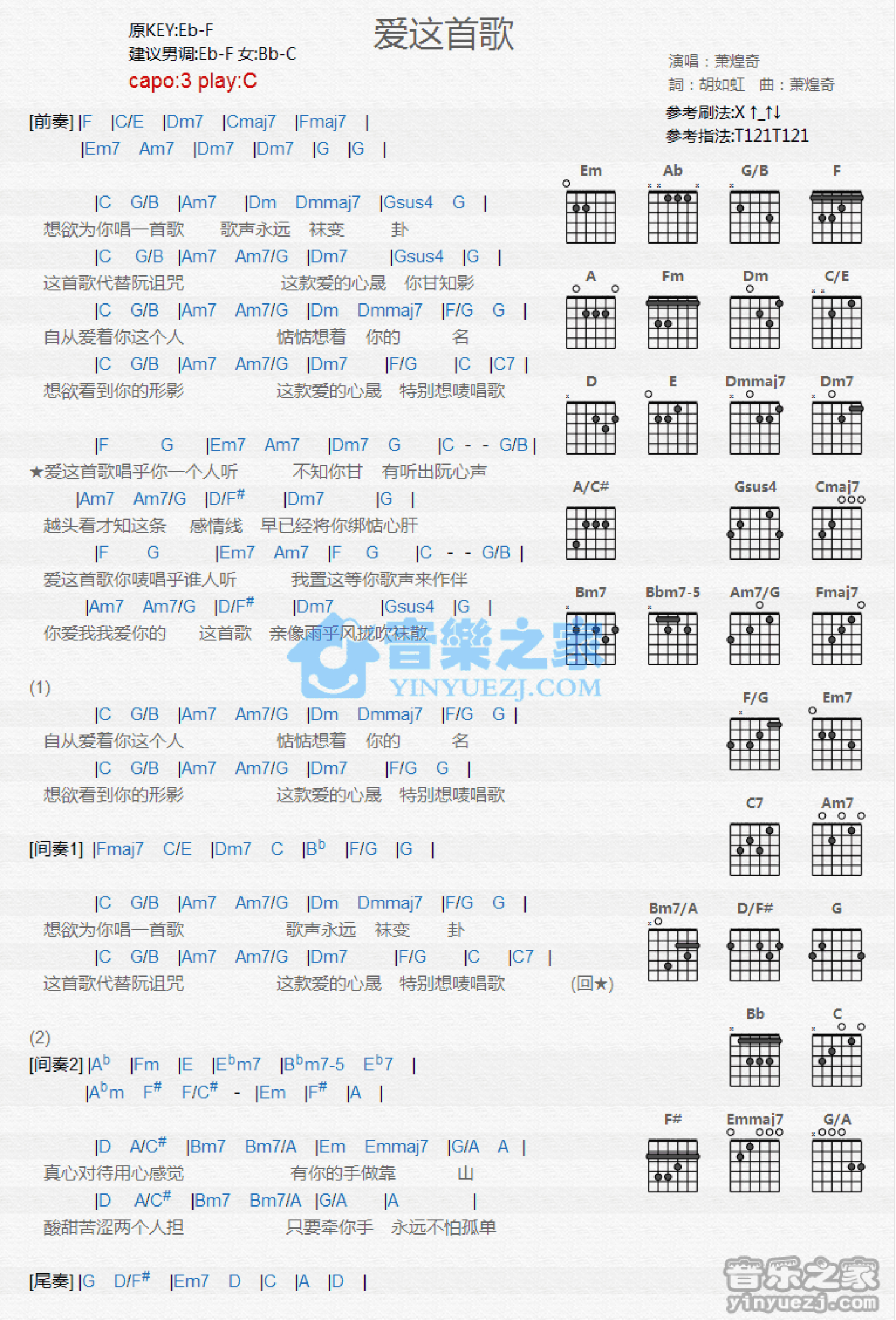 曲谱介绍: C调版萧煌奇《爱这首歌》吉他和弦弹唱谱