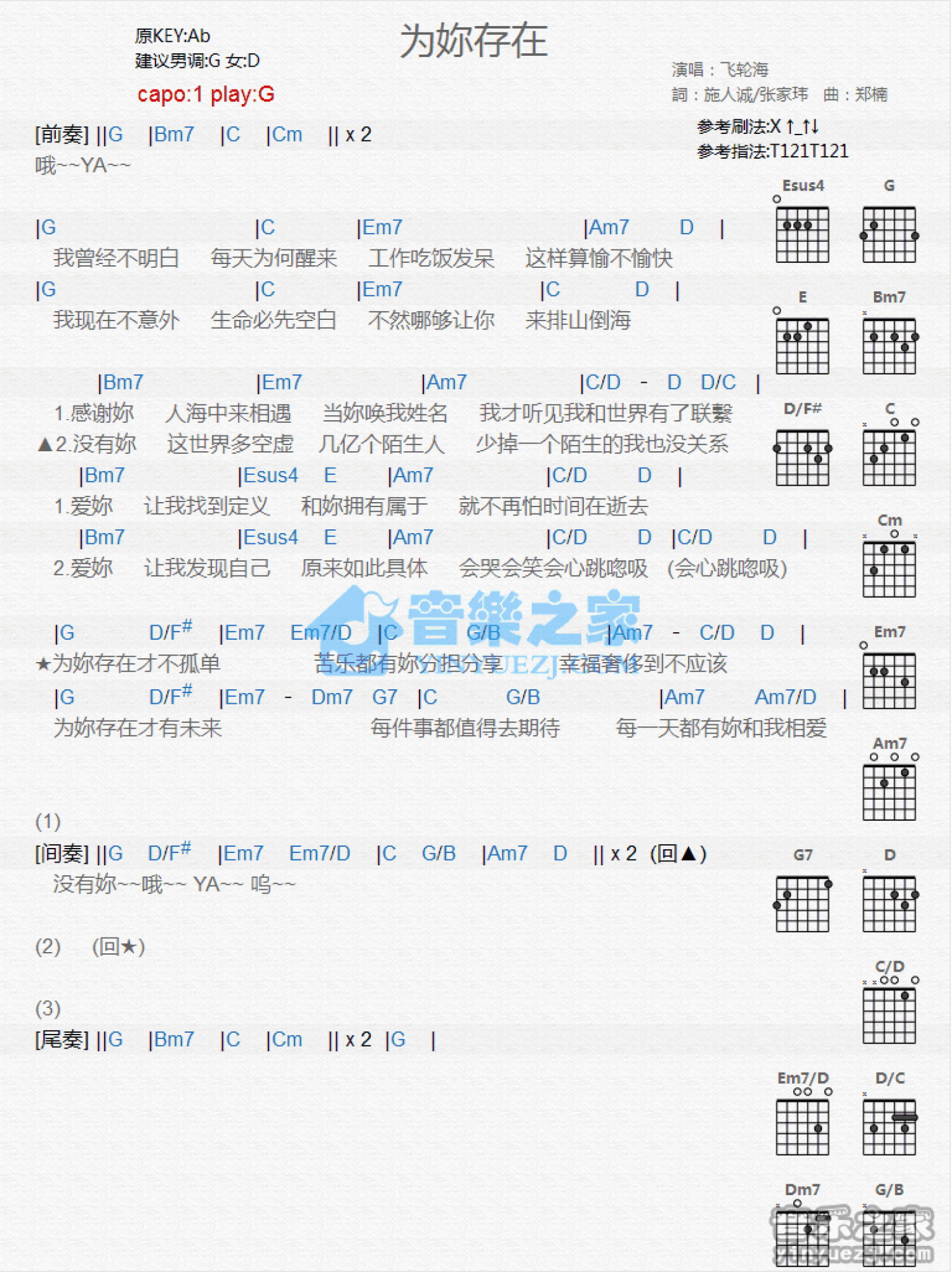 曲谱介绍: G调版《为你存在》吉他和弦弹唱谱