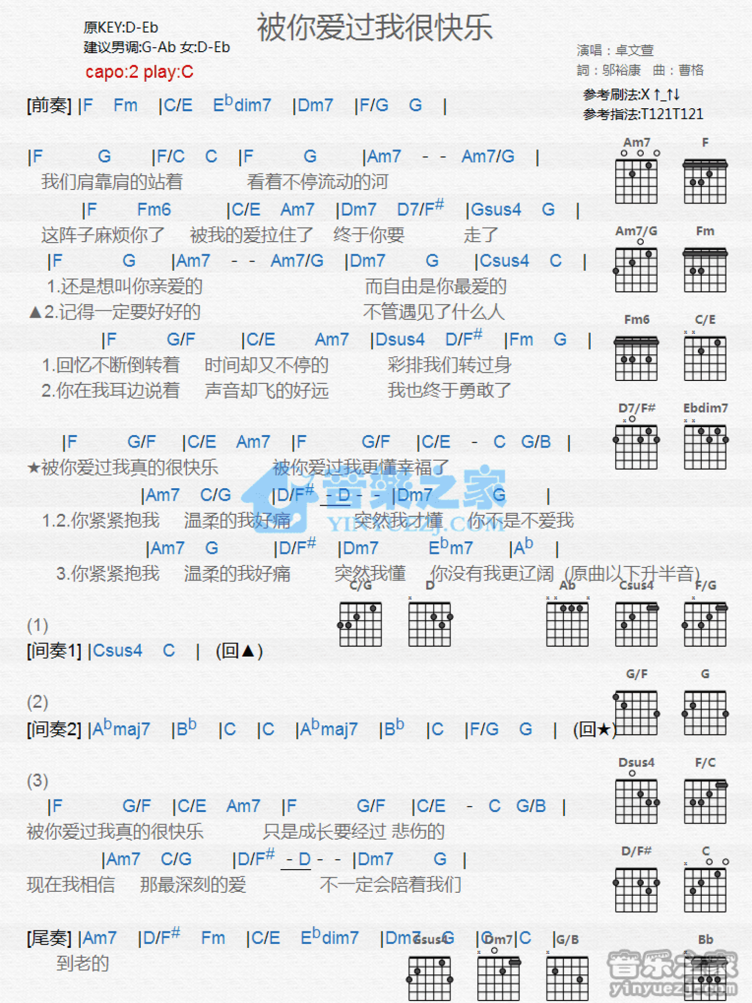 曲谱介绍: C调版《被你爱过我很快乐》吉他和弦弹唱谱