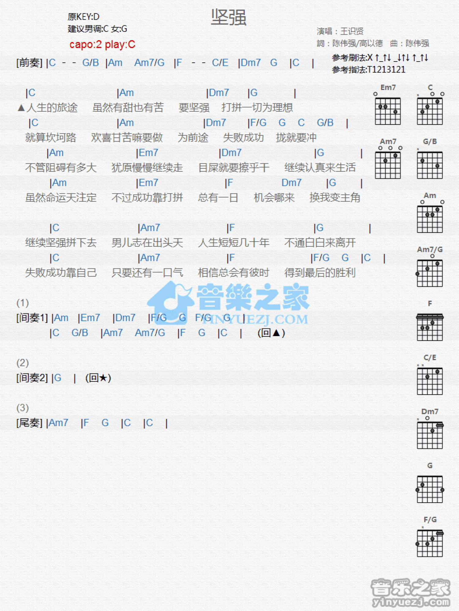 曲谱介绍: C调版王识贤《坚强》吉他和弦弹唱谱