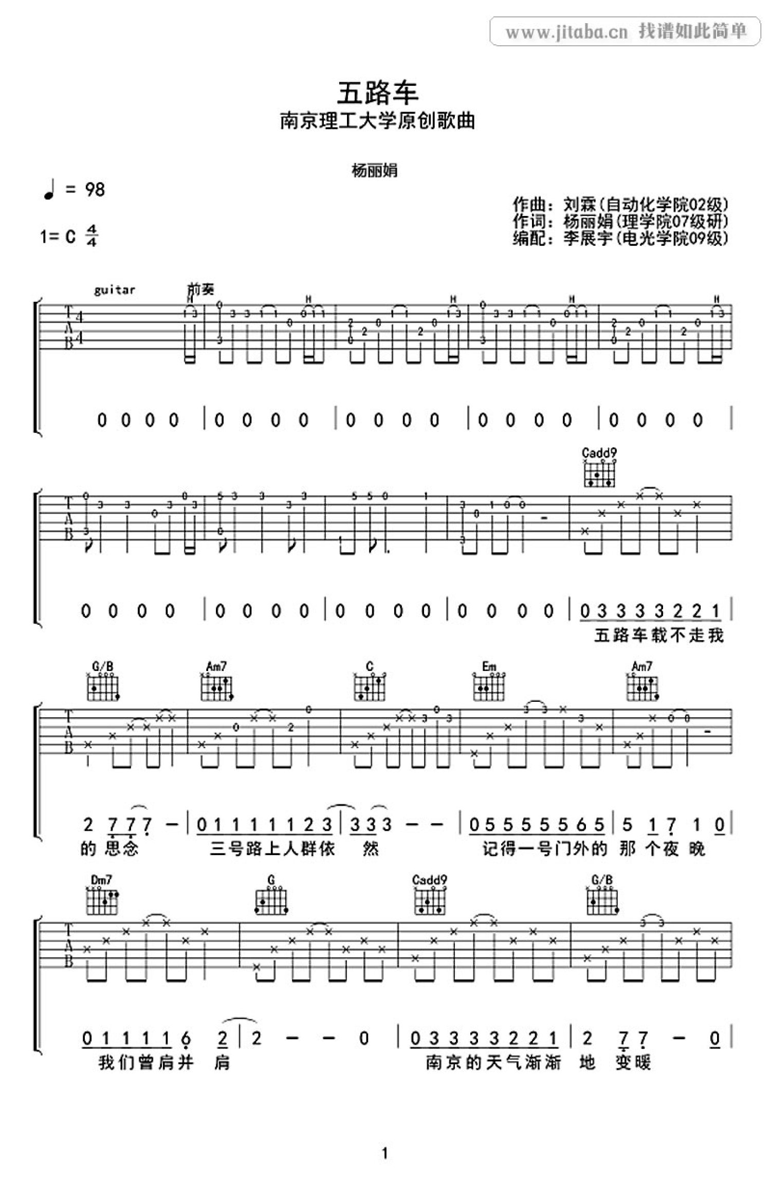 曲谱介绍: 五路车吉他谱,南京理工大学原创歌曲,杨丽娟演唱,民谣吉他风,五路车吉他弹唱谱,C调六线谱编配。它是南京理工大学首张原创音乐专辑《三号路》的主打歌,南理工的记忆留在这一首歌里。