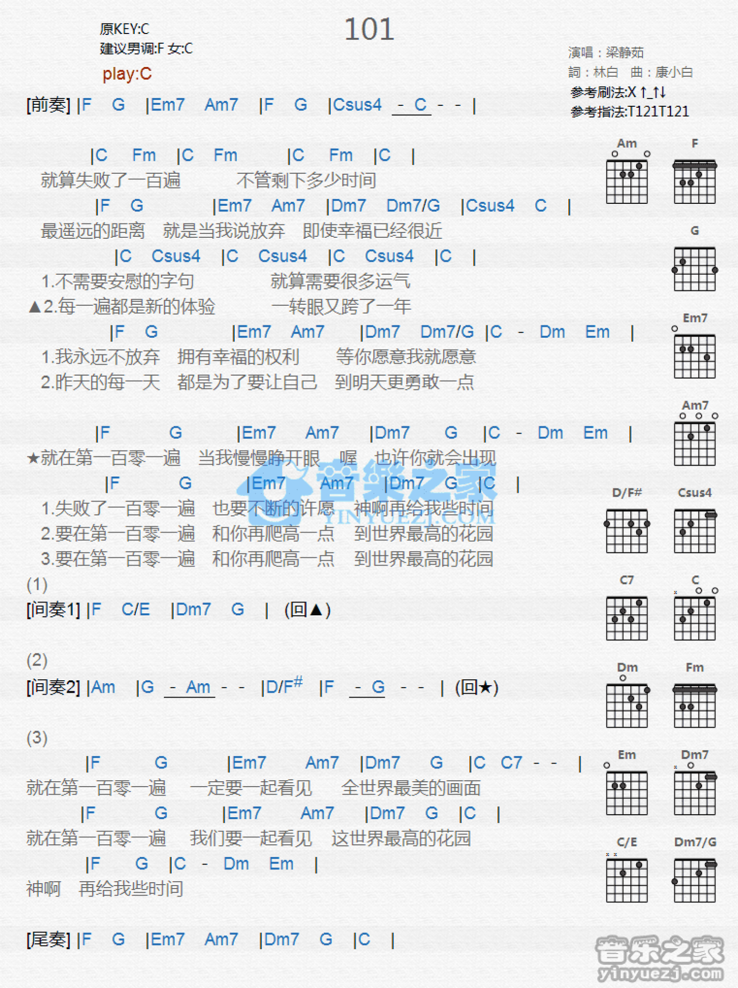 曲谱介绍: C调版梁静茹《101》吉他和弦弹唱谱