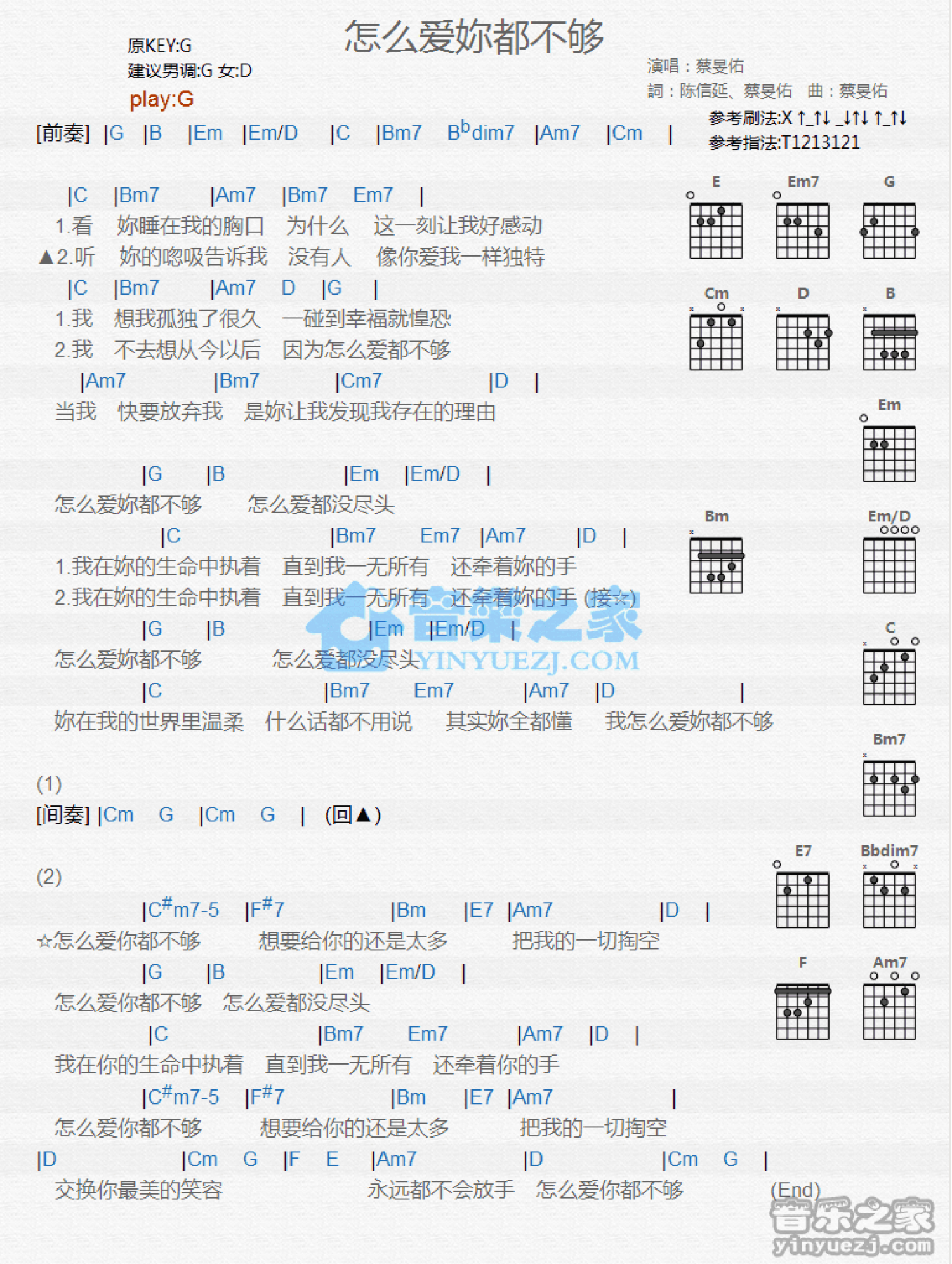 曲谱介绍: G调版蔡F佑《怎么爱你都不够》吉他和弦弹唱谱