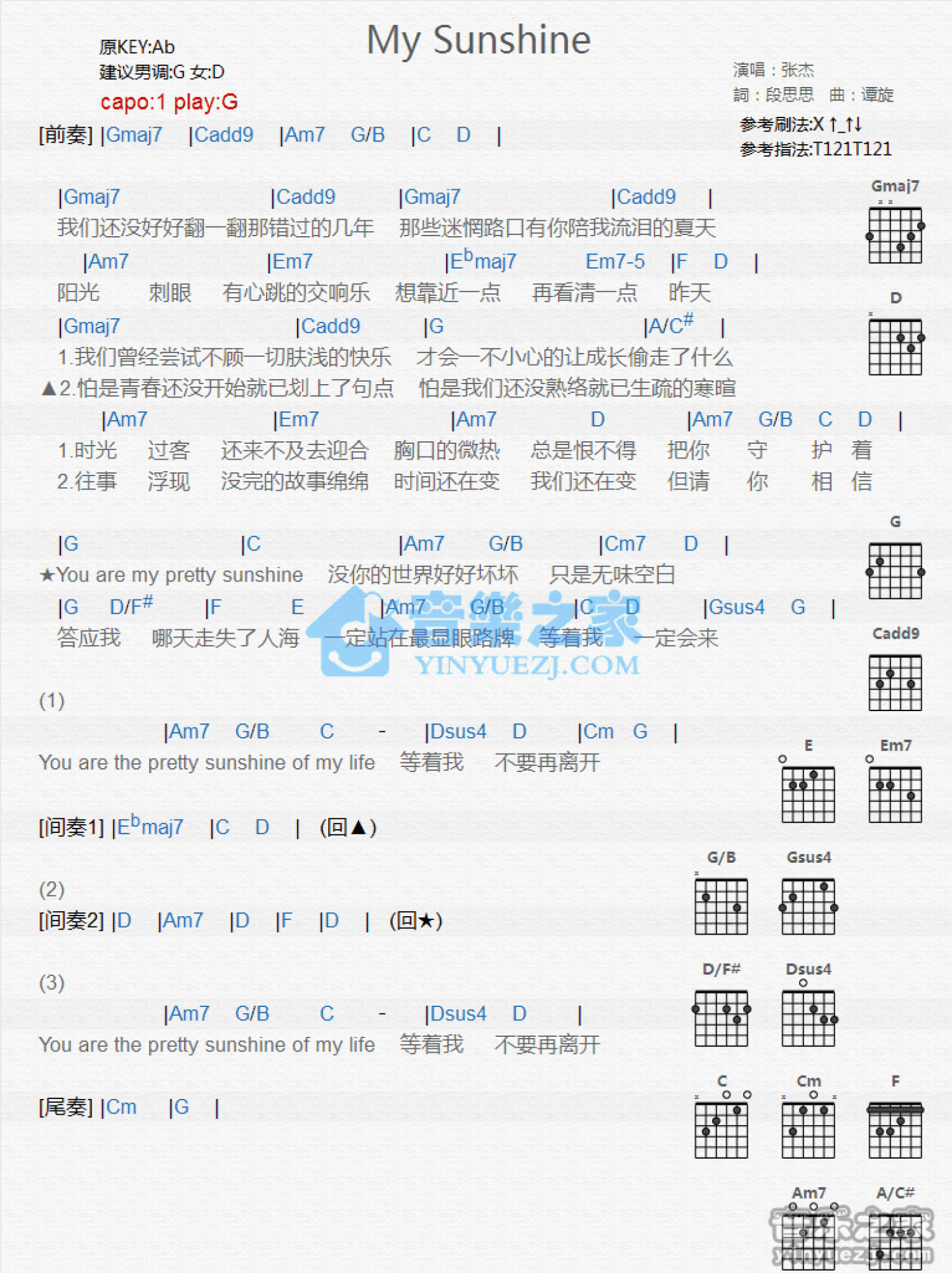 曲谱介绍: G调版张杰《MySunshine》吉他和弦弹唱谱