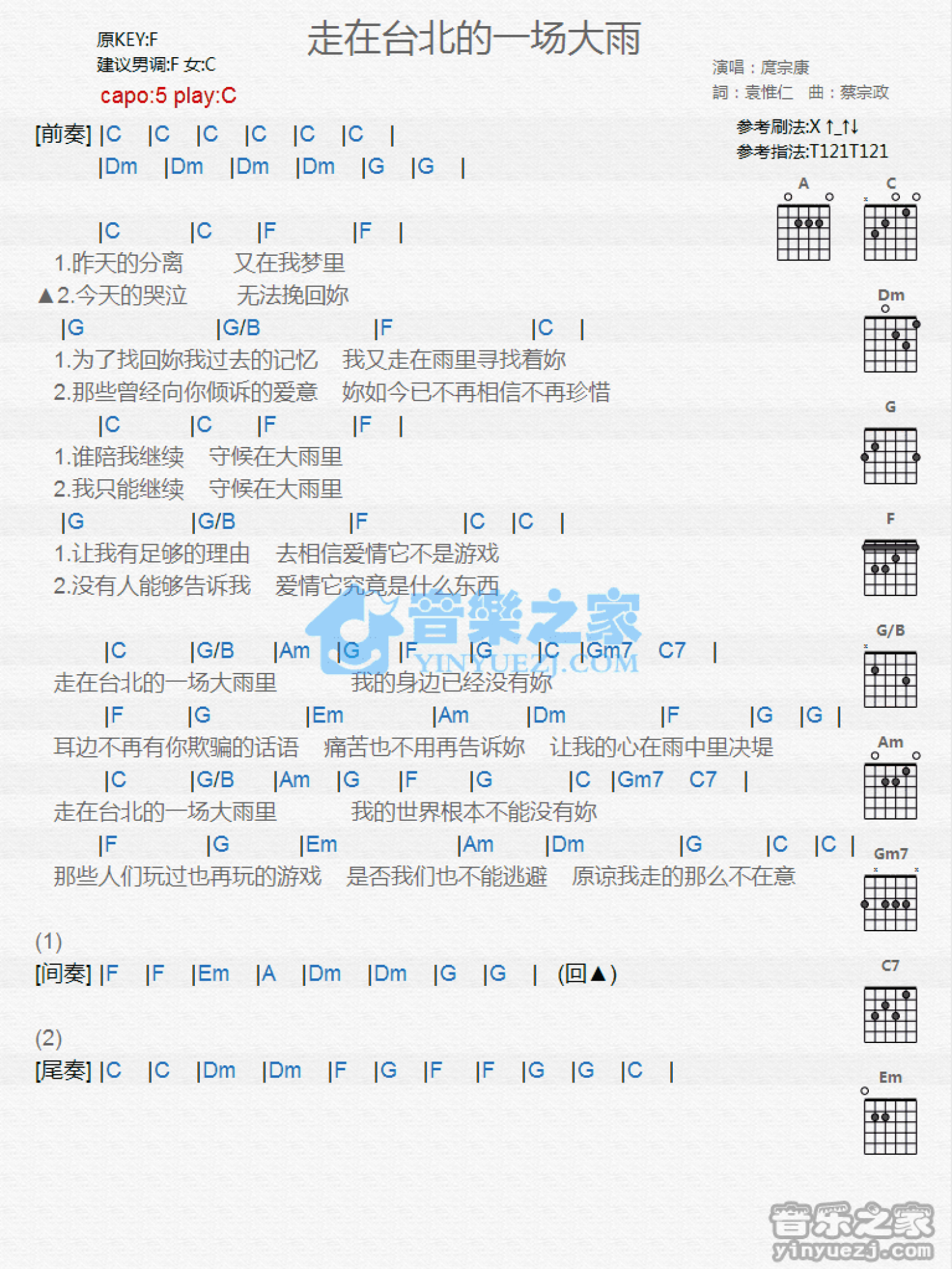 曲谱介绍: C调版庹宗康《走在台北的一场大雨》吉他和弦弹唱谱
