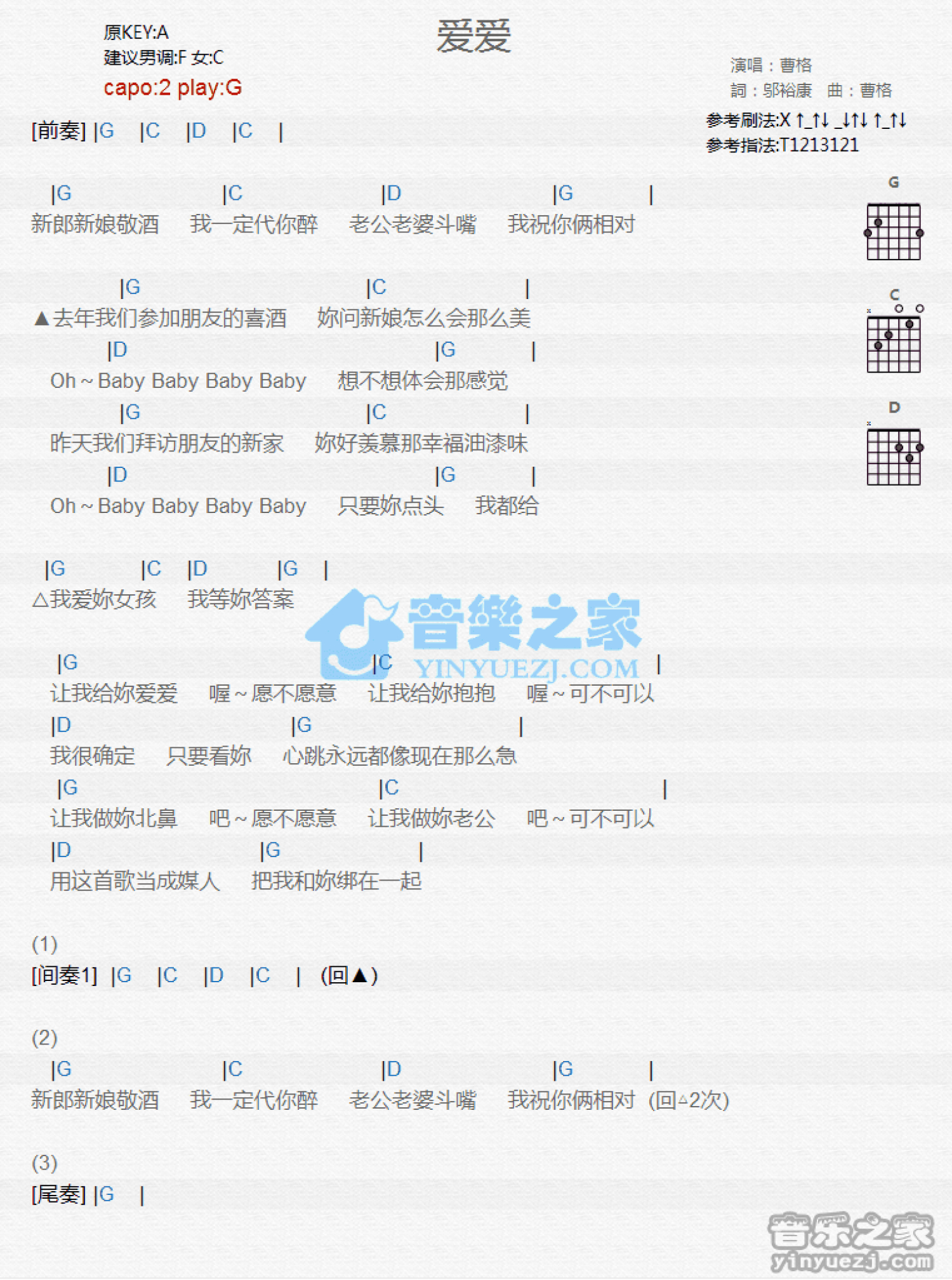 曲谱介绍: G调版曹格《爱爱》吉他和弦弹唱谱