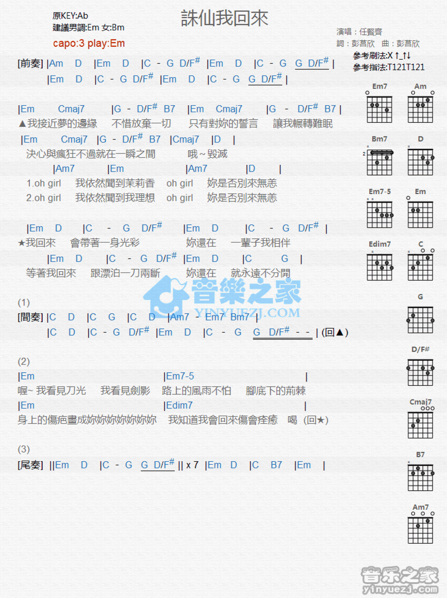 曲谱介绍: Em调版任贤齐《诛仙我回来》吉他和弦弹唱谱