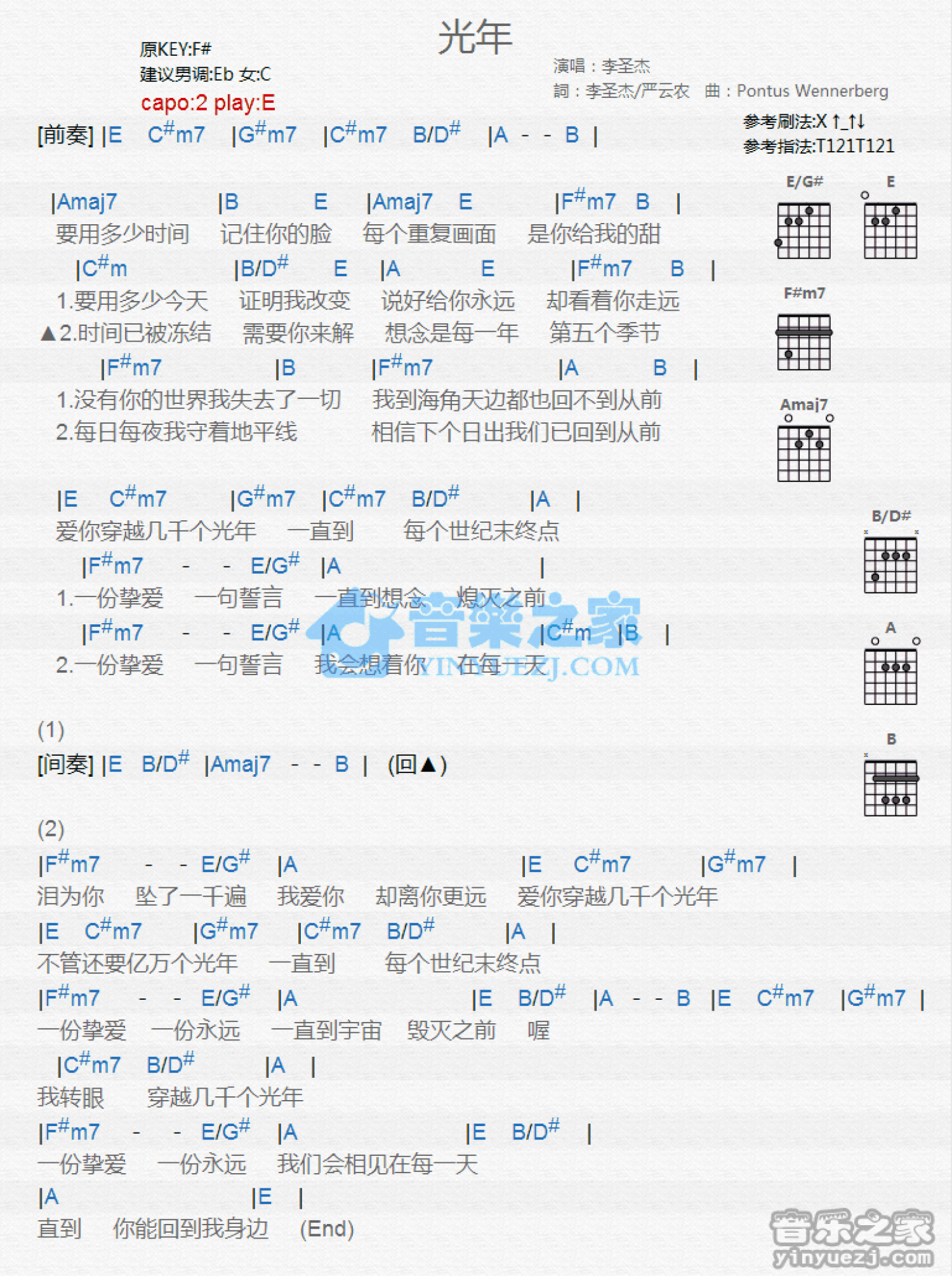 曲谱介绍: E调版李圣杰《光年》吉他和弦弹唱谱