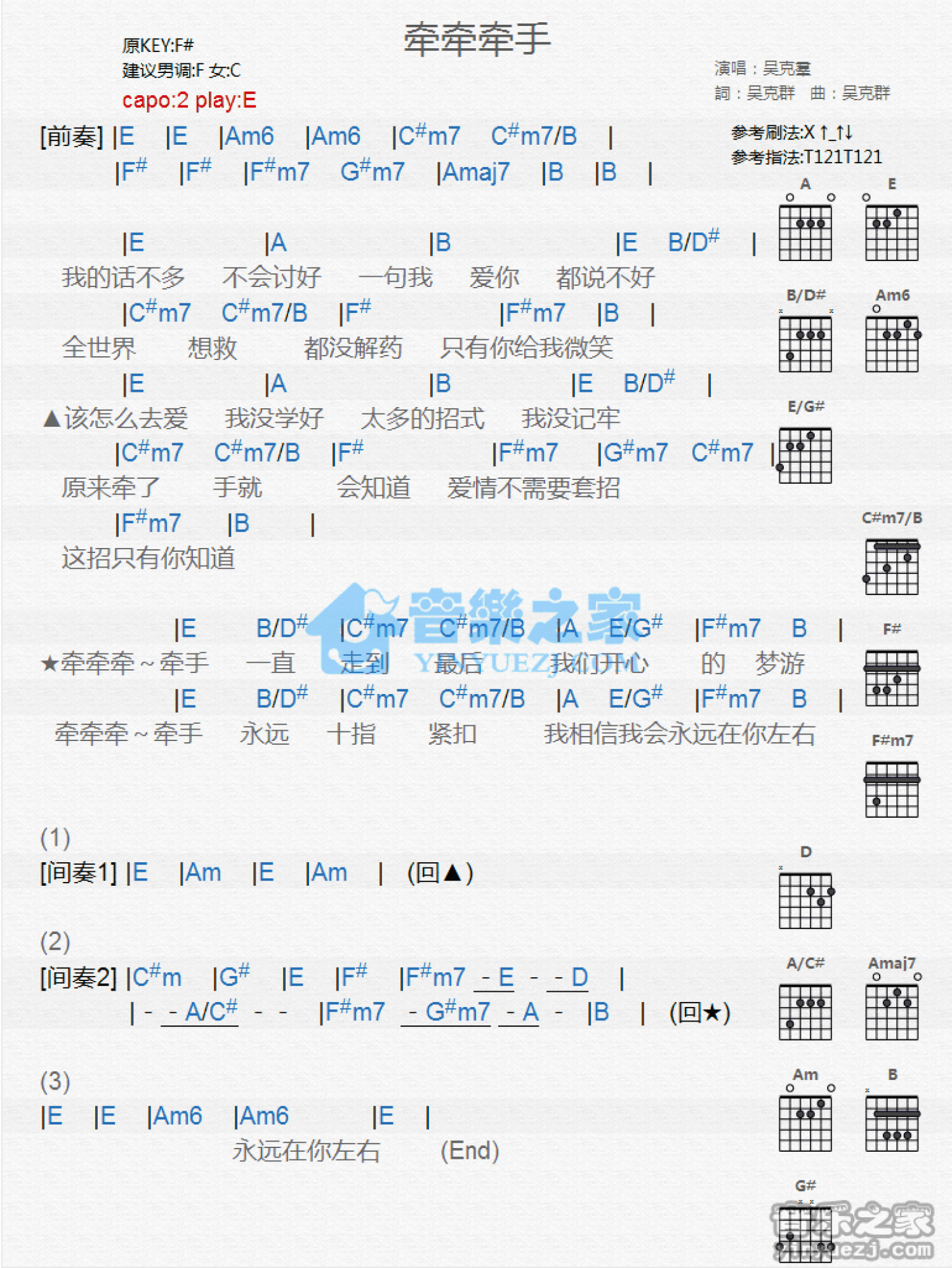曲谱介绍: E调版吴克t《牵牵手》吉他和弦弹唱谱