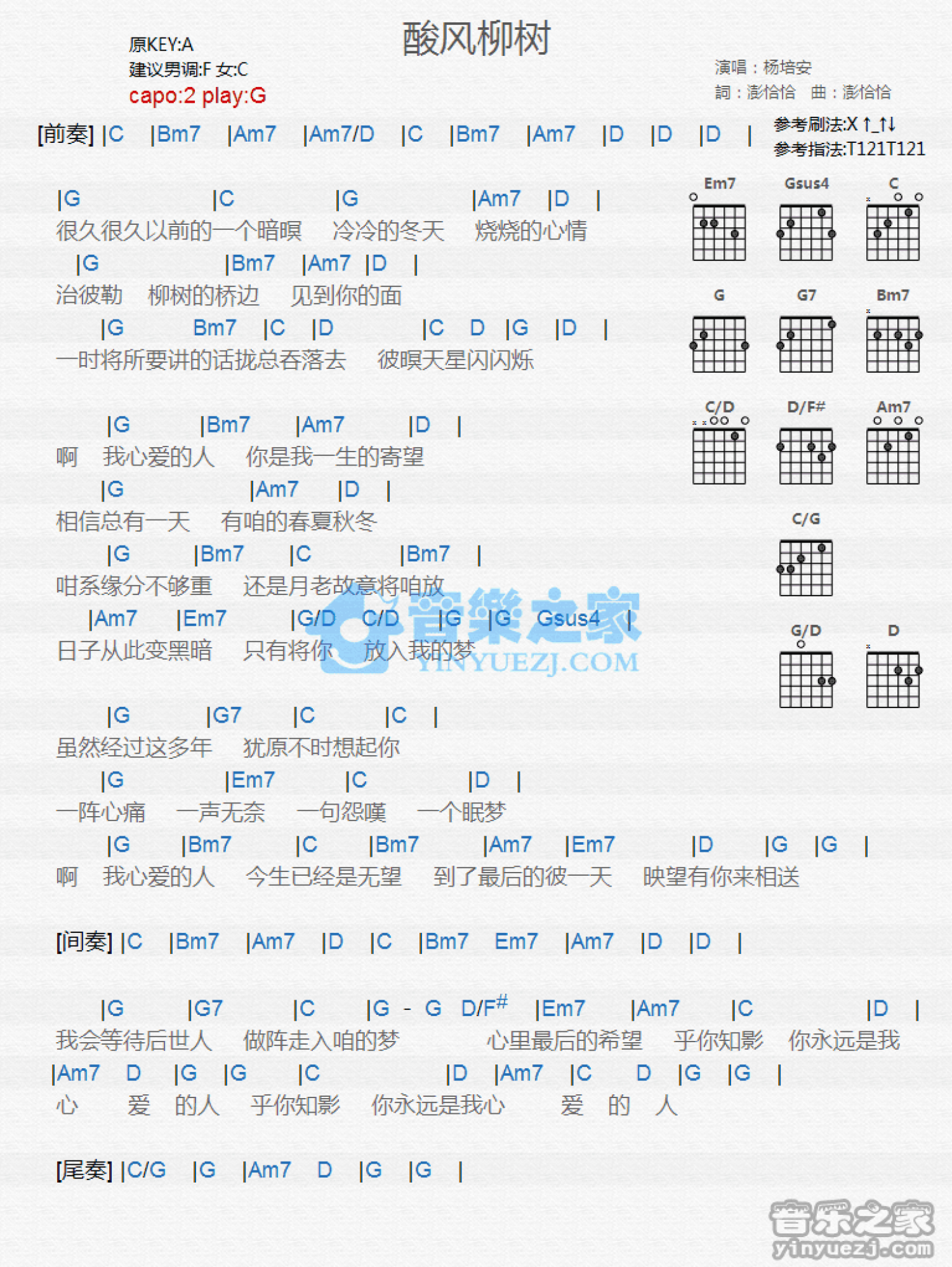 曲谱介绍: G调版杨培安《酸风柳树》吉他和弦弹唱谱