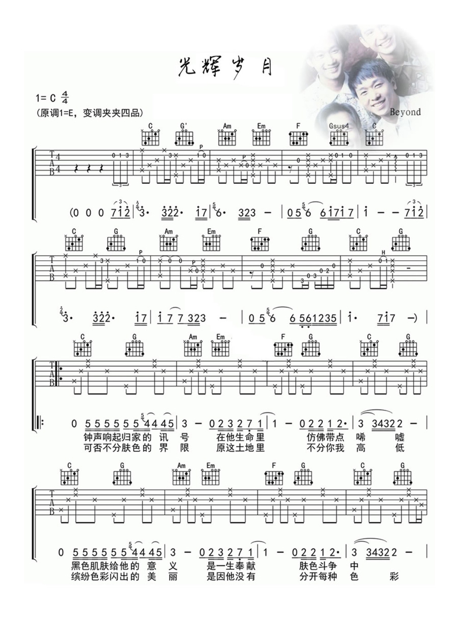 光辉岁月吉他谱 - Beyond - C调吉他弹唱谱