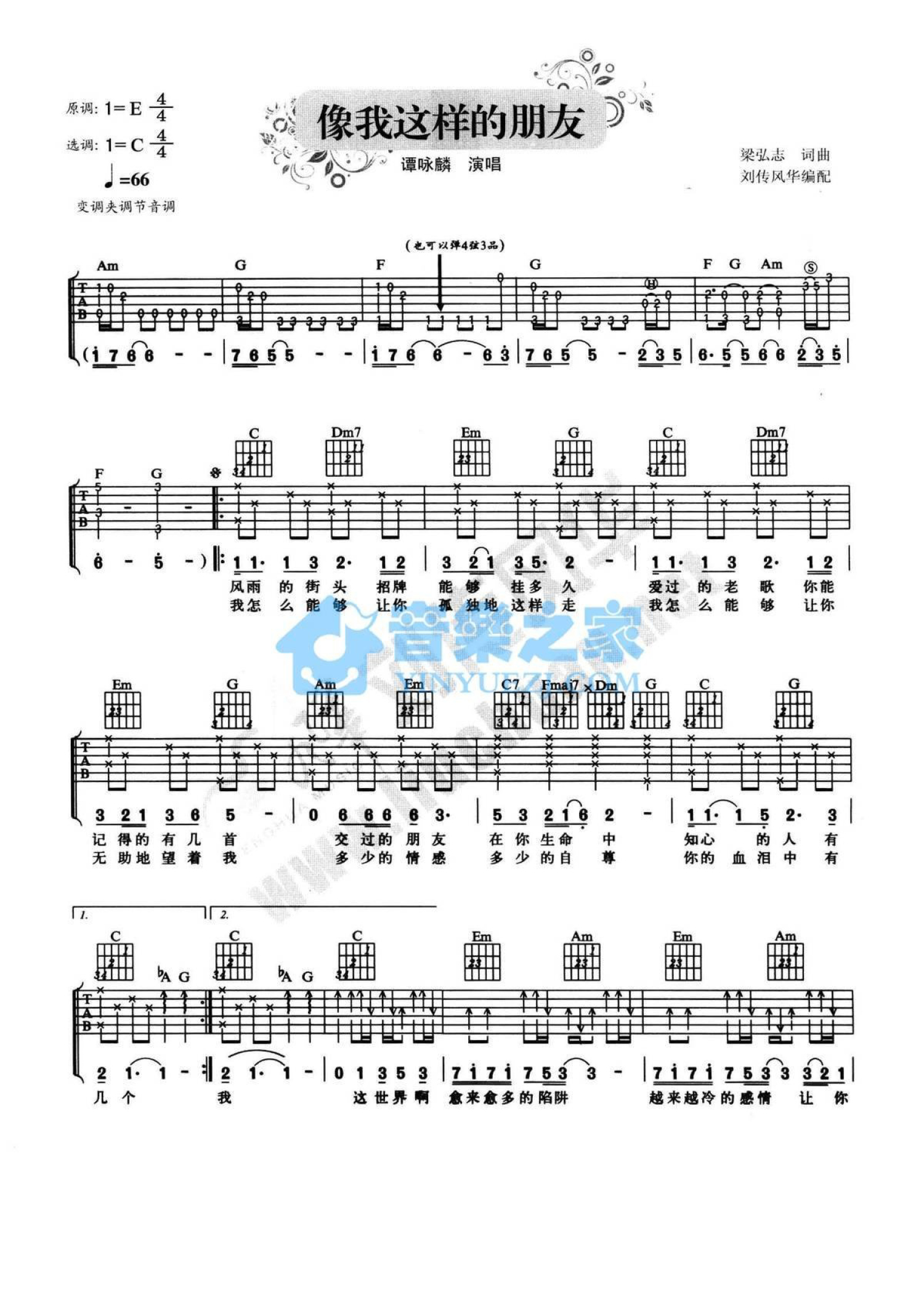 曲谱介绍: C调版谭咏麟《像我这样的朋友》吉他弹唱六线谱