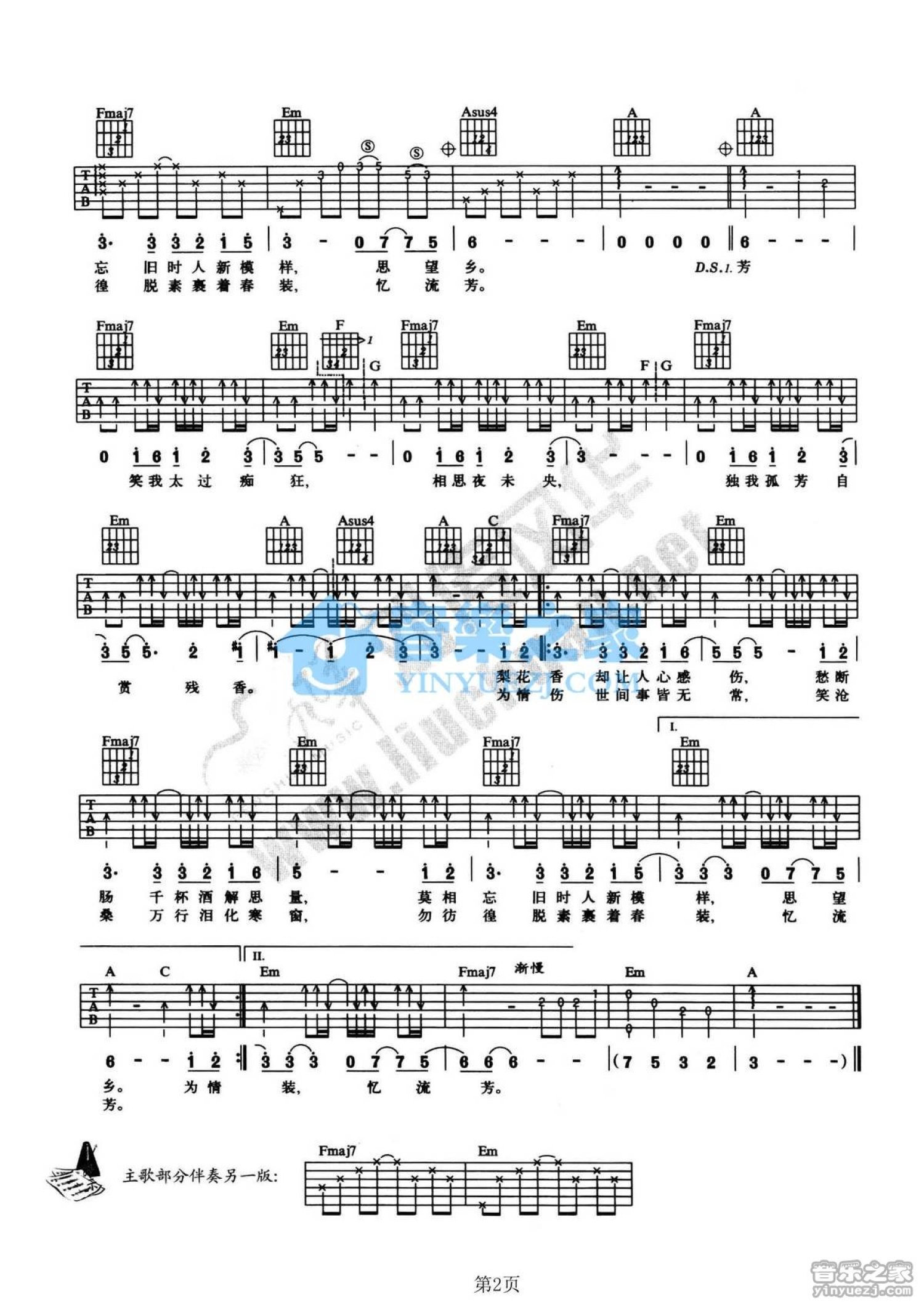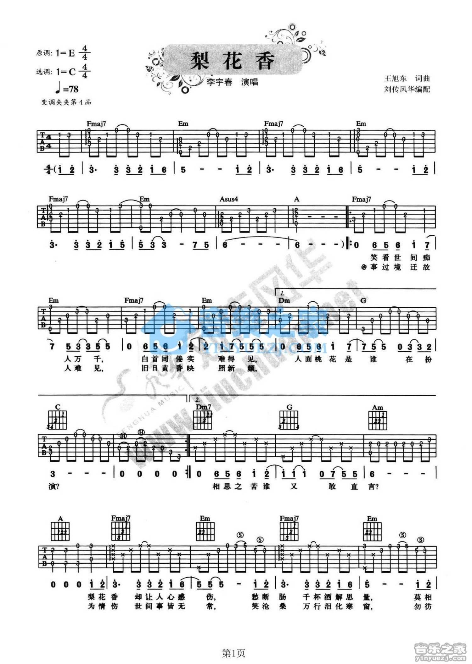 曲谱介绍: C调版《梨花香》吉他弹唱六线谱