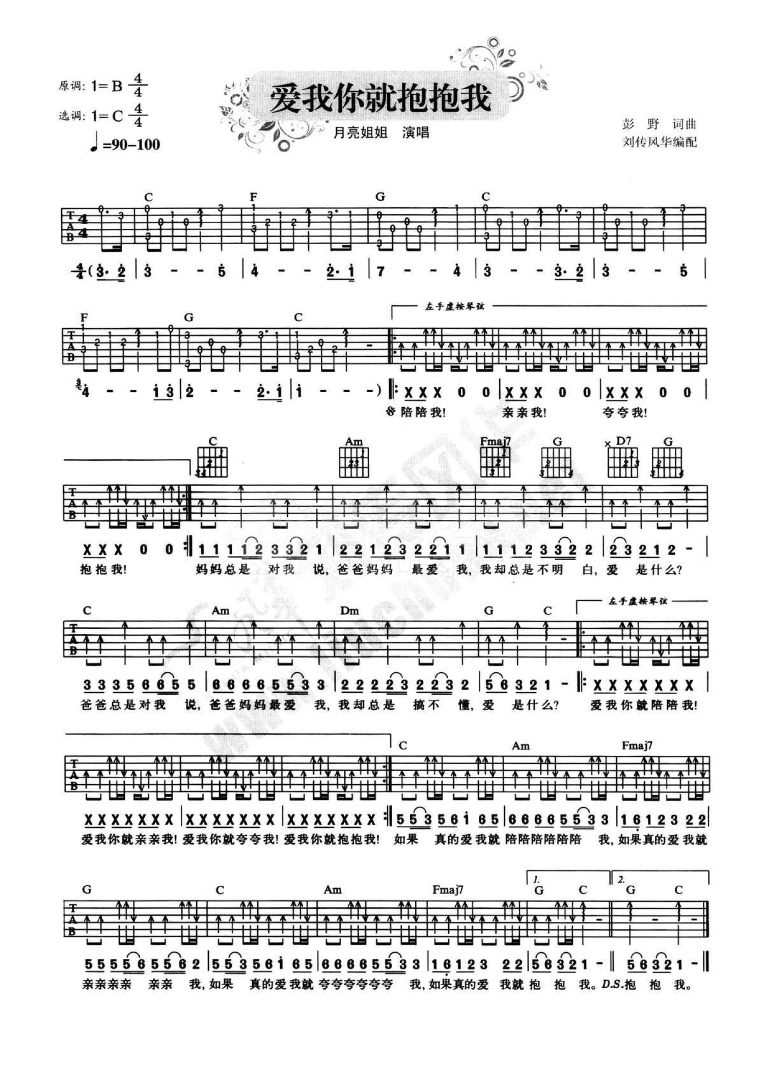 曲谱介绍: C调版《爱我你就抱抱我》吉他弹唱六线谱