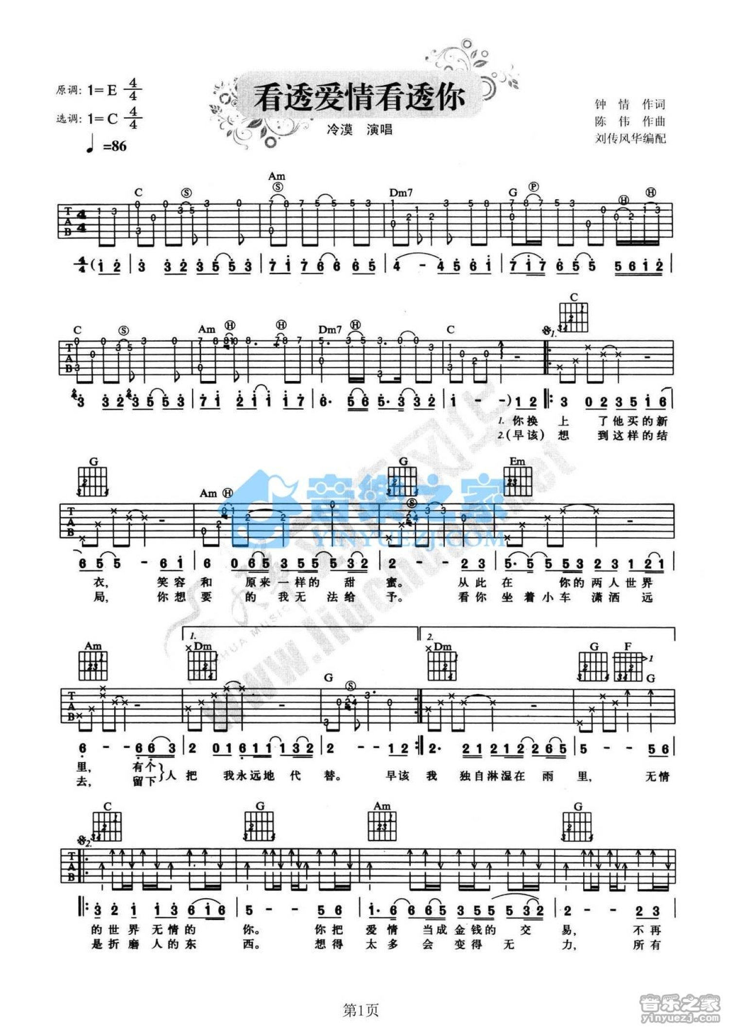 曲谱介绍: C调版冷漠《看透爱情看透你》吉他弹唱六线谱