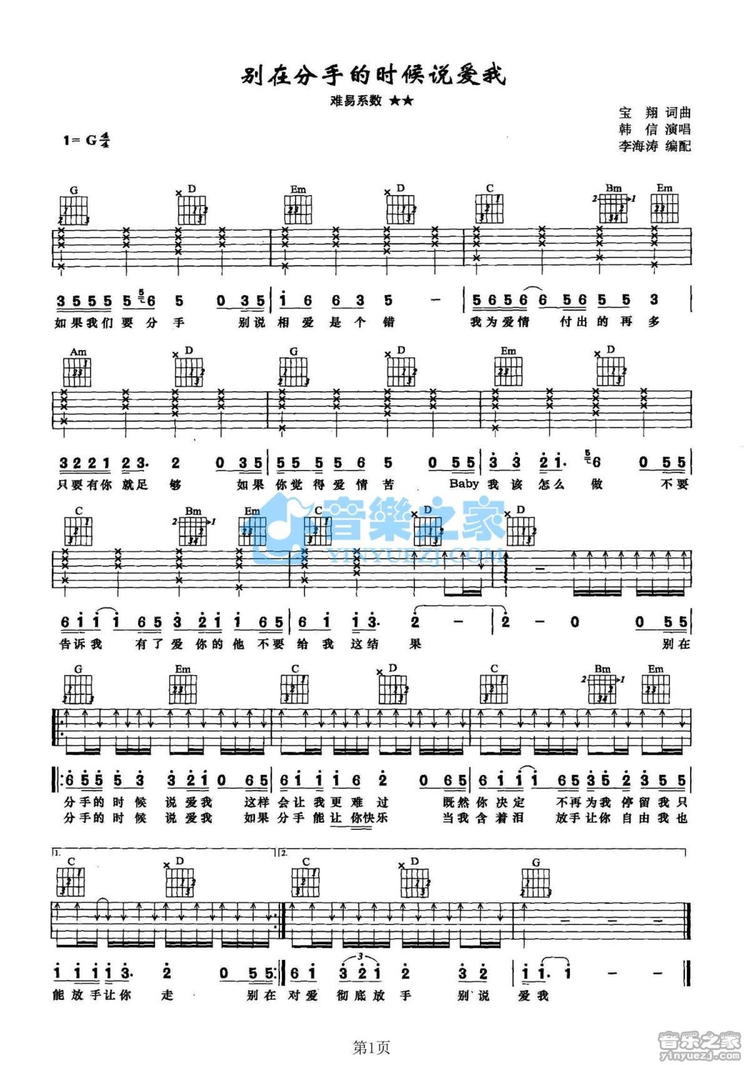 曲谱介绍: G调版《别在分手的时候说爱我》吉他弹唱六线谱