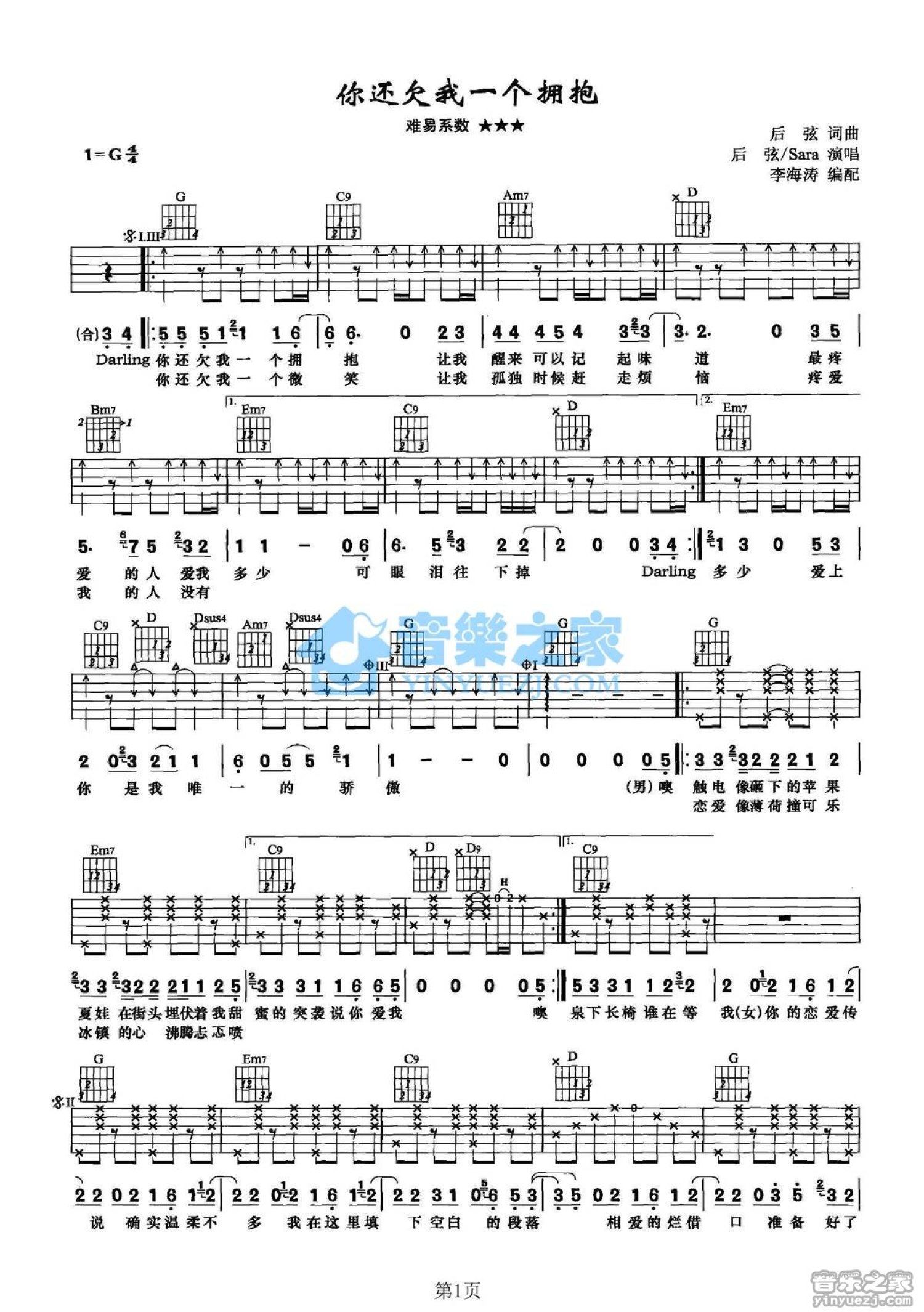 曲谱介绍: G调版《你还欠我一个拥抱》吉他弹唱六线谱