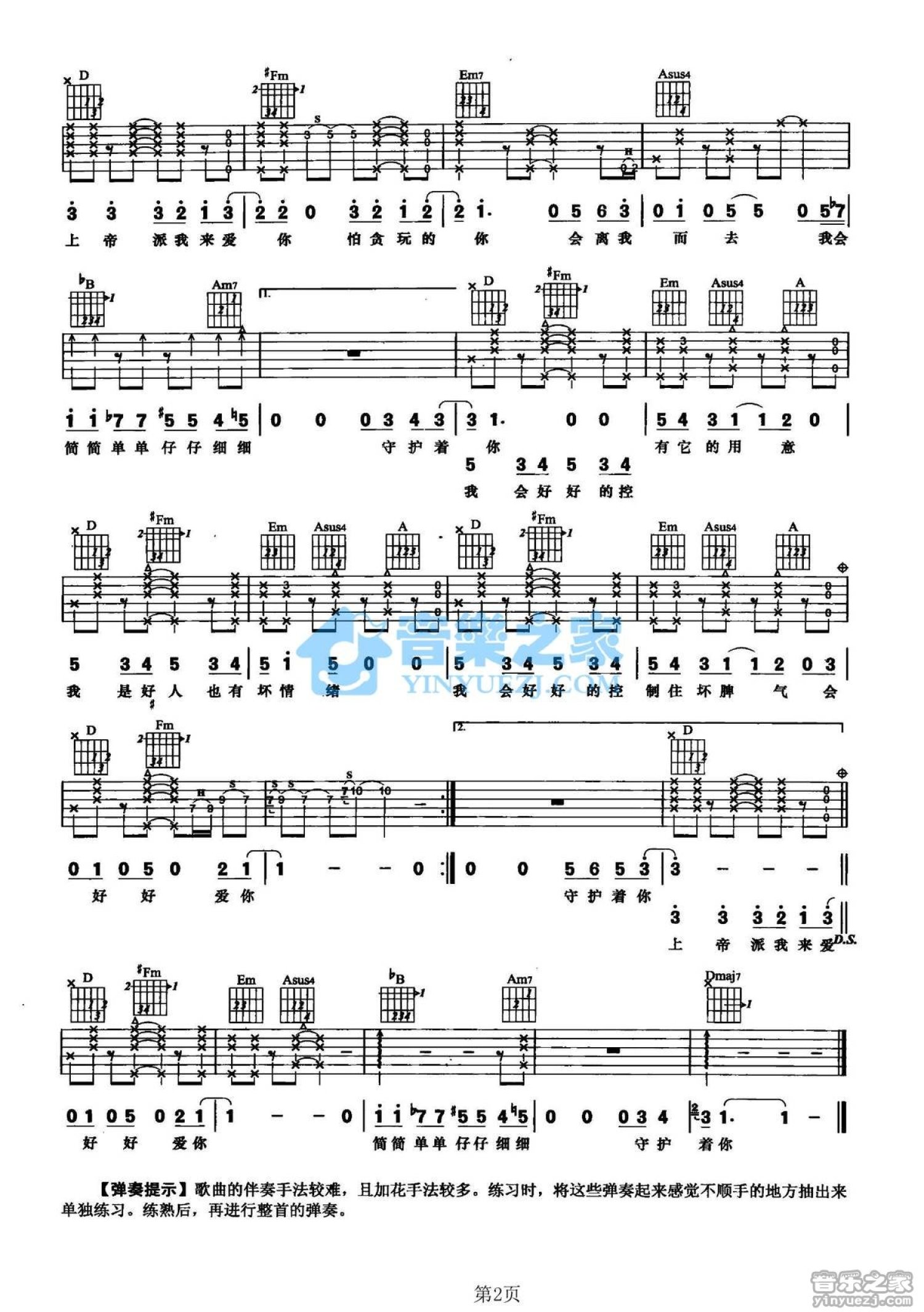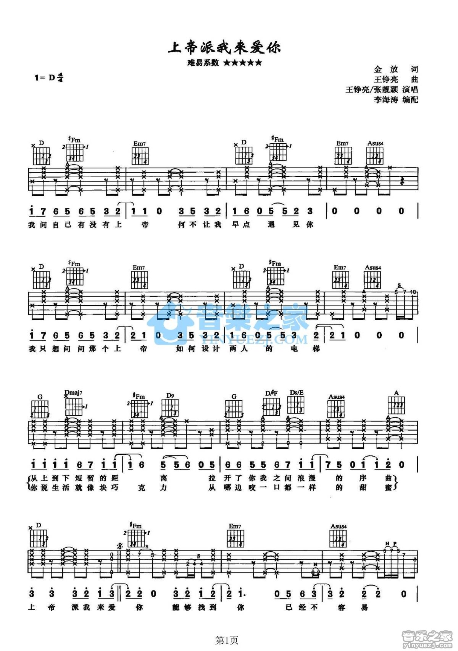 曲谱介绍: D调版王铮亮《上帝派我来爱你》吉他弹唱六线谱