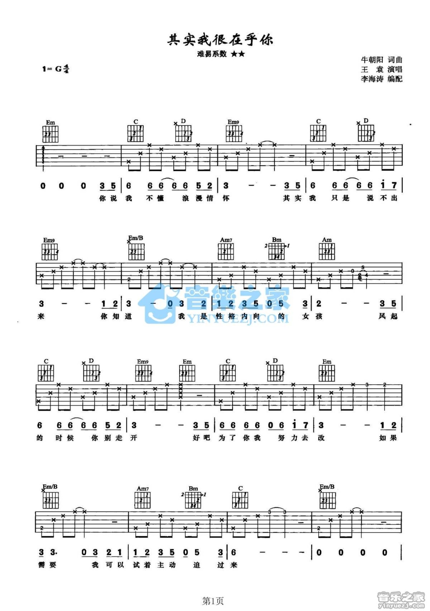 曲谱介绍: G调版王袁《其实我很在乎你》吉他弹唱六线谱