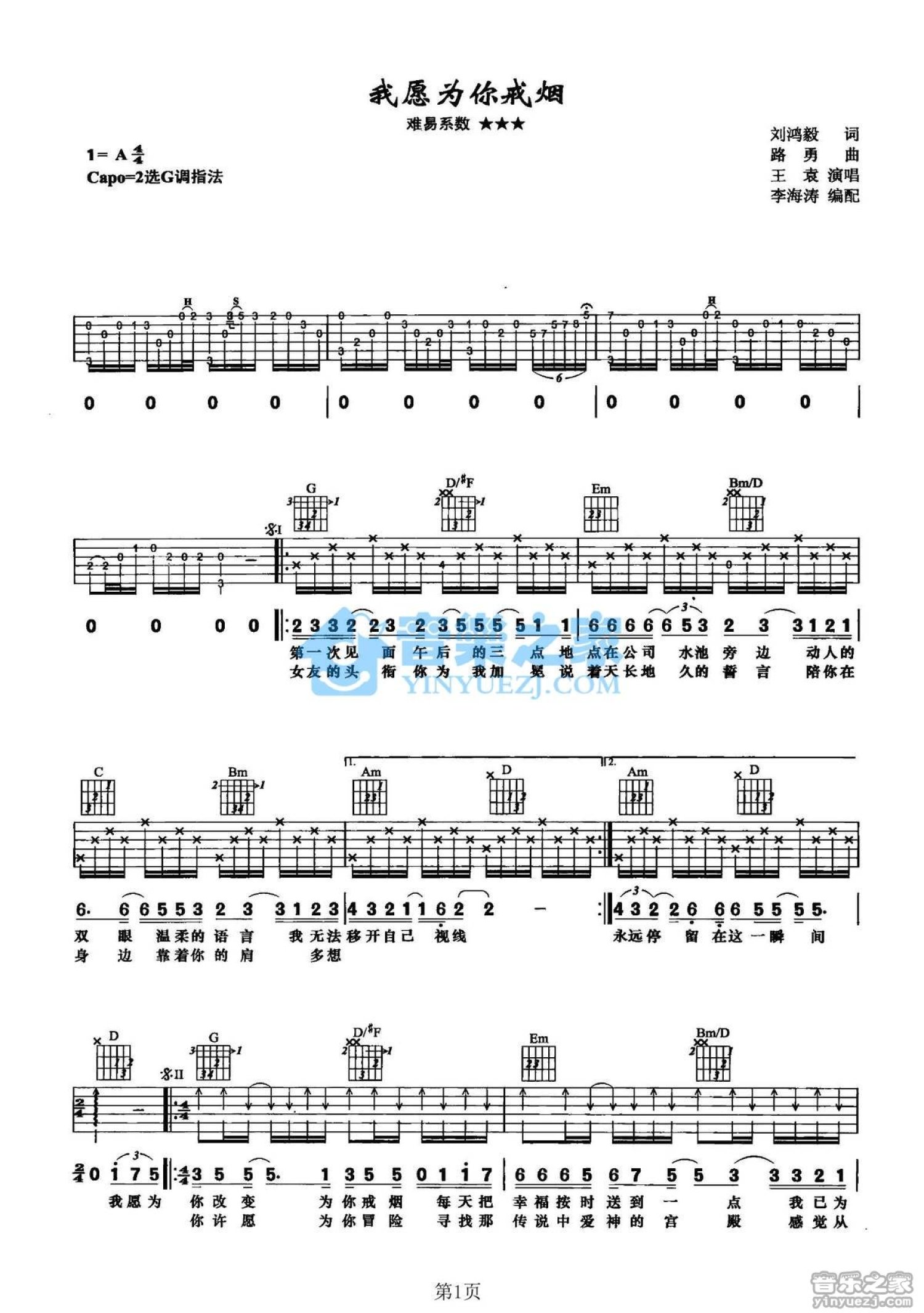 曲谱介绍: G调版 王袁《我愿为你戒烟》吉他弹唱六线谱