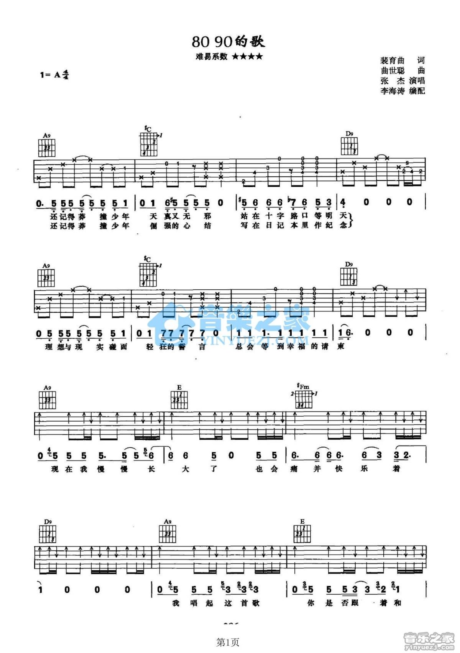 曲谱介绍: A调版张杰《8090的歌》吉他弹唱六线谱