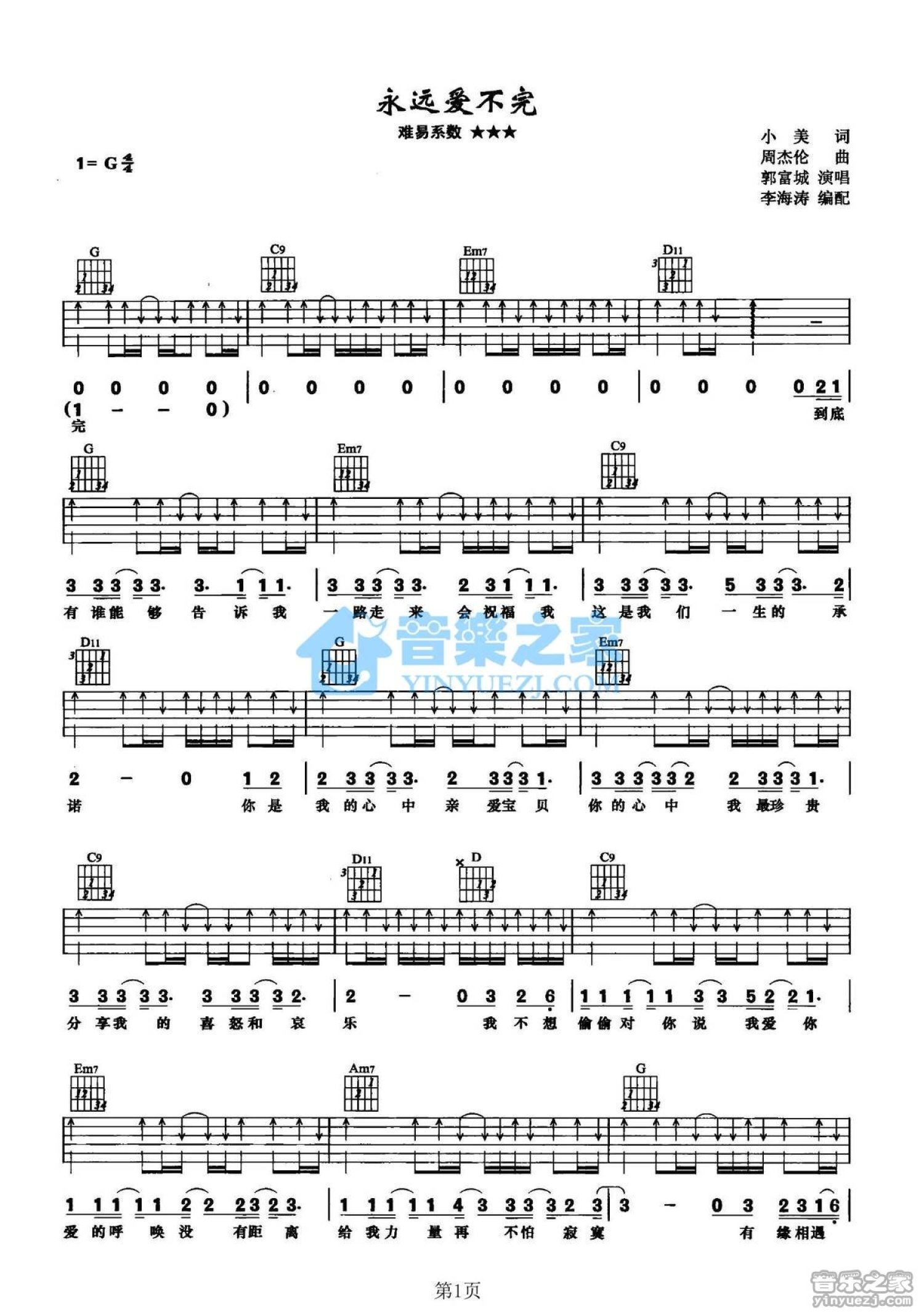 曲谱介绍: G调版郭富城《永远爱不完》吉他弹唱六线谱