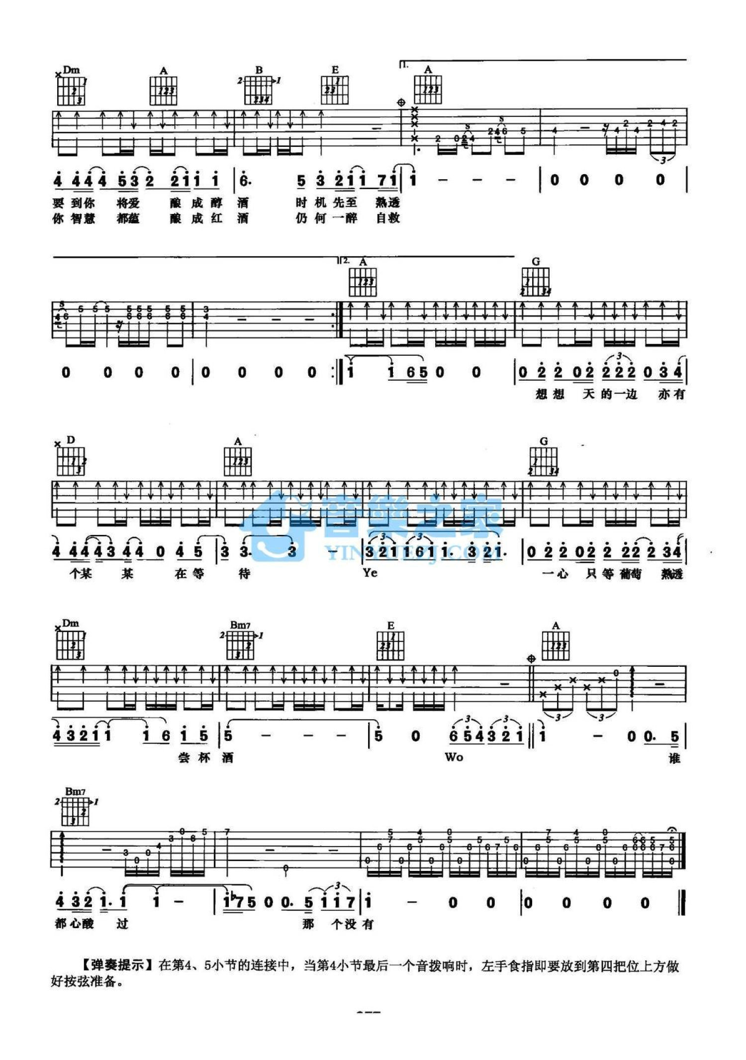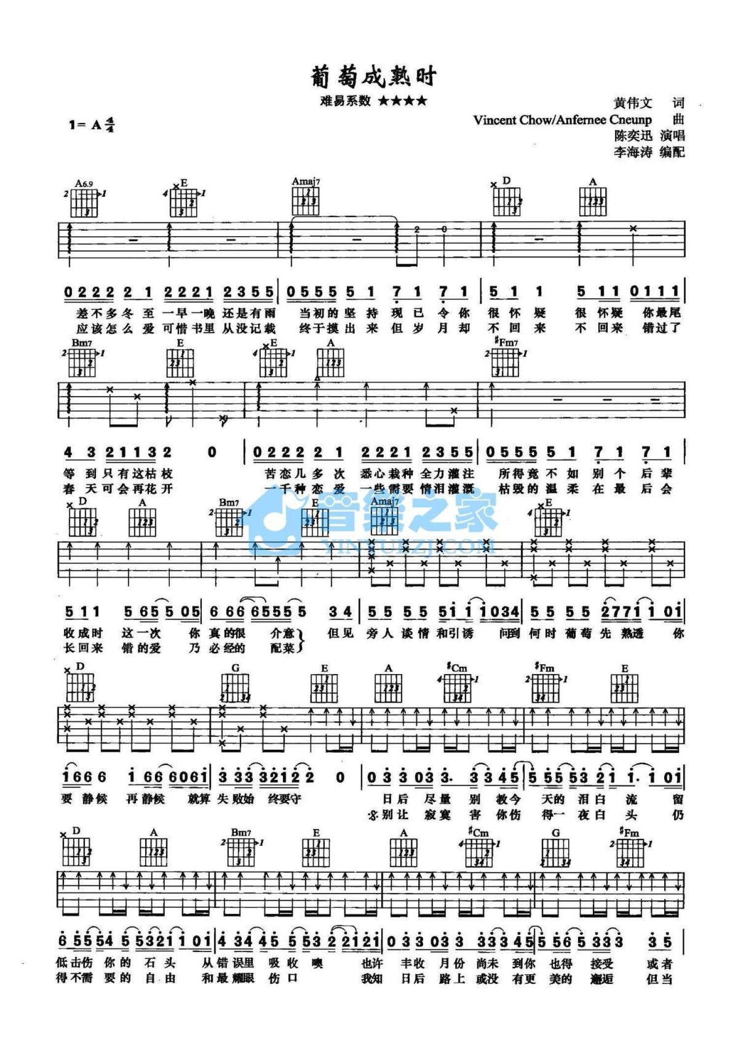 曲谱介绍: A调版《葡萄成熟时》吉他弹唱六线谱