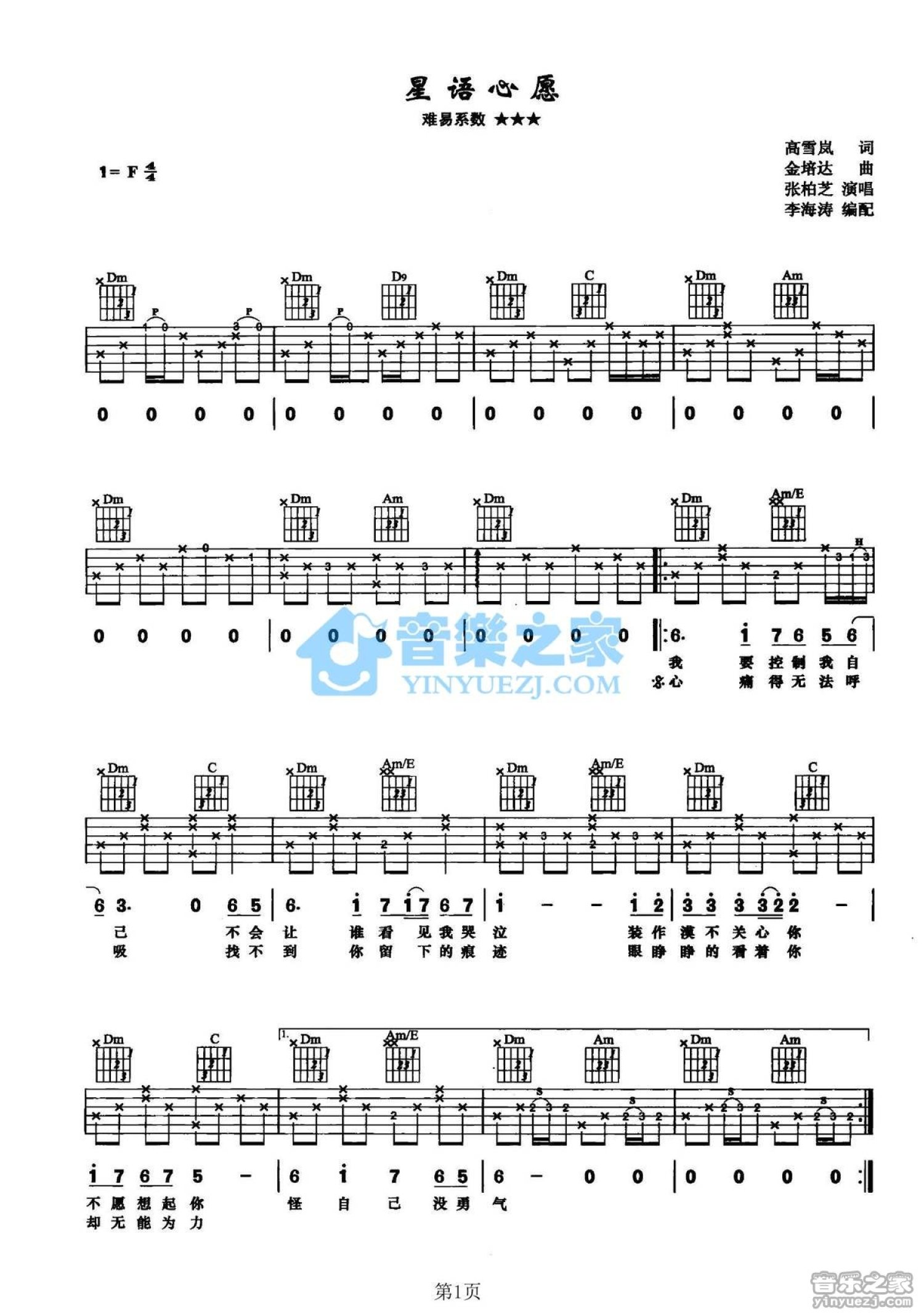 曲谱介绍: F调版《星语星愿》吉他弹唱六线谱