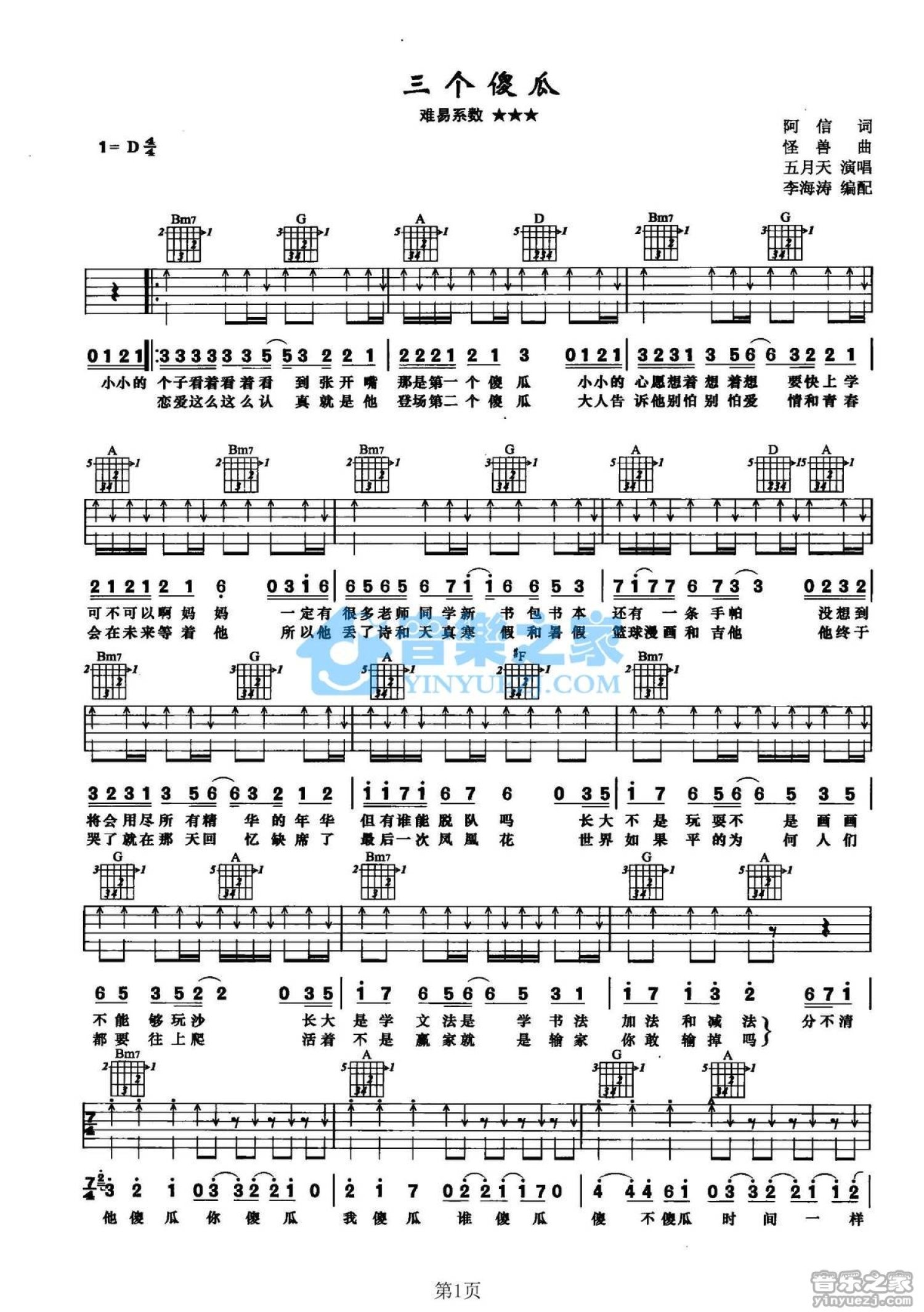 曲谱介绍: D调版 五月天《三个傻瓜》吉他弹唱六线谱
