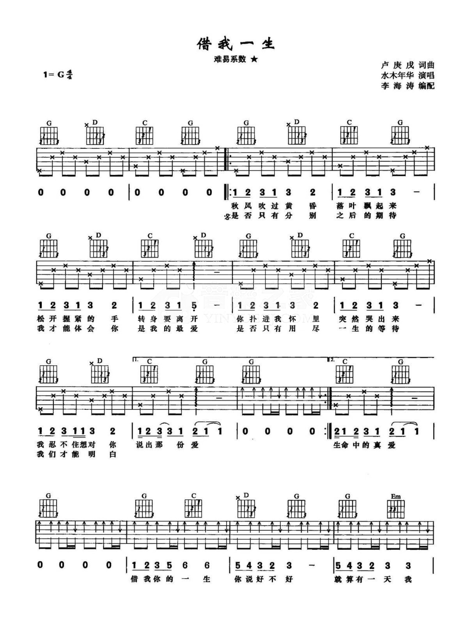 曲谱介绍: G调版《借我一生》吉他弹唱六线谱