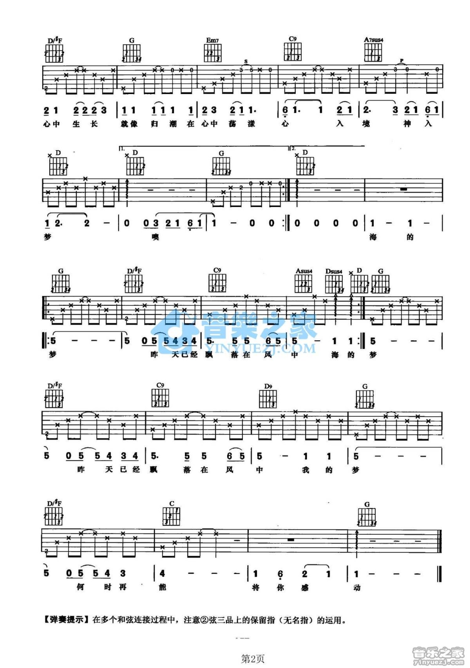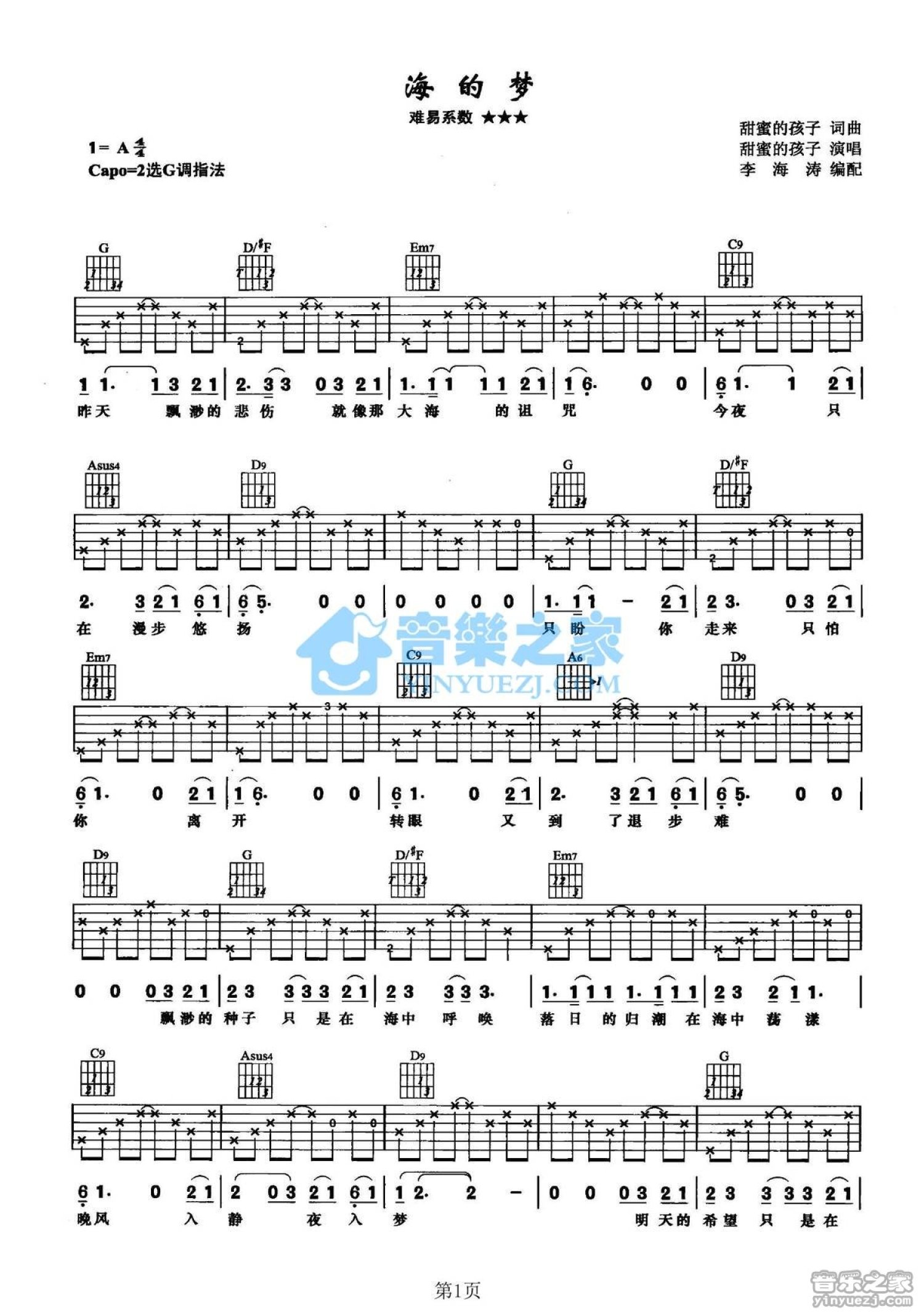 曲谱介绍: G调版甜蜜的孩子《海的梦》吉他弹唱六线谱