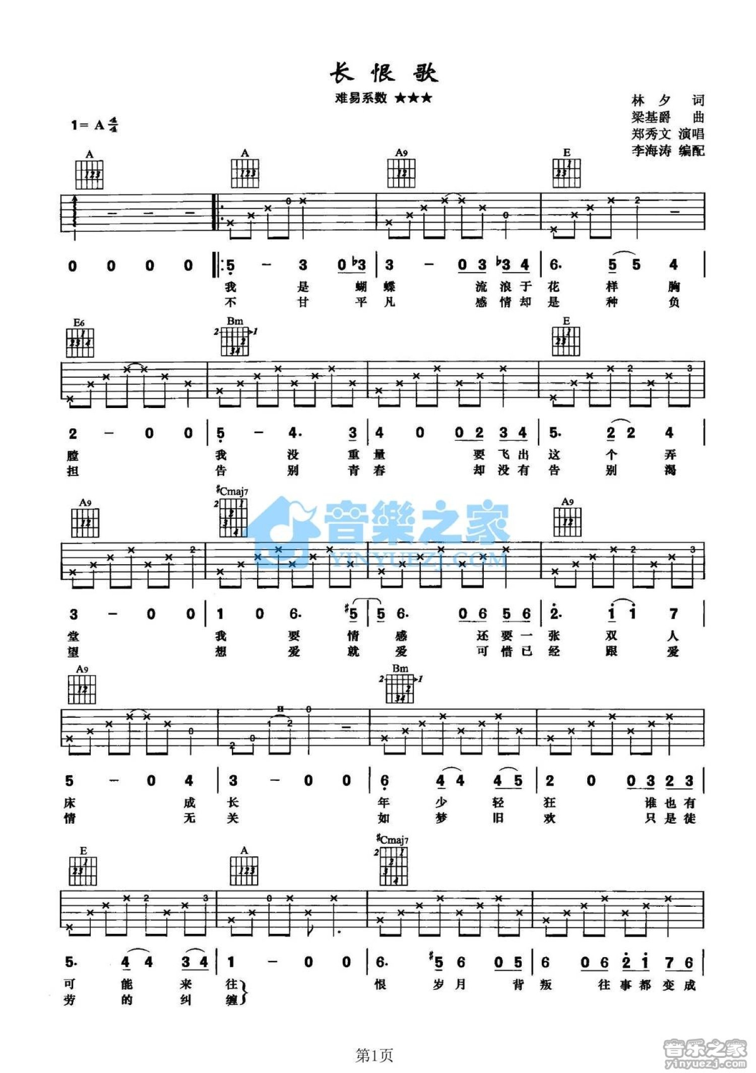 曲谱介绍: A调版郑秀文《长恨歌》吉他弹唱六线谱