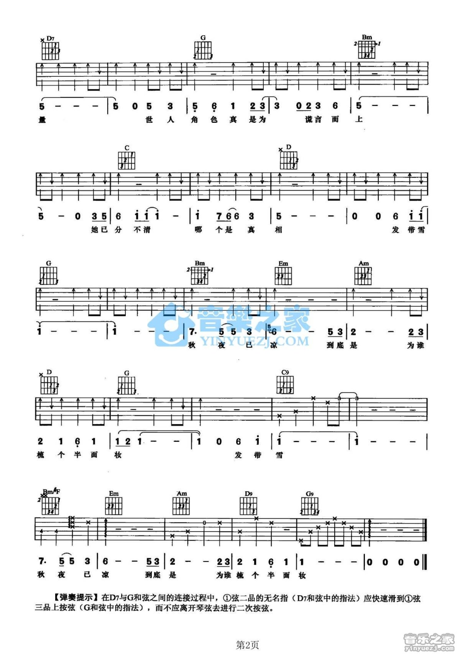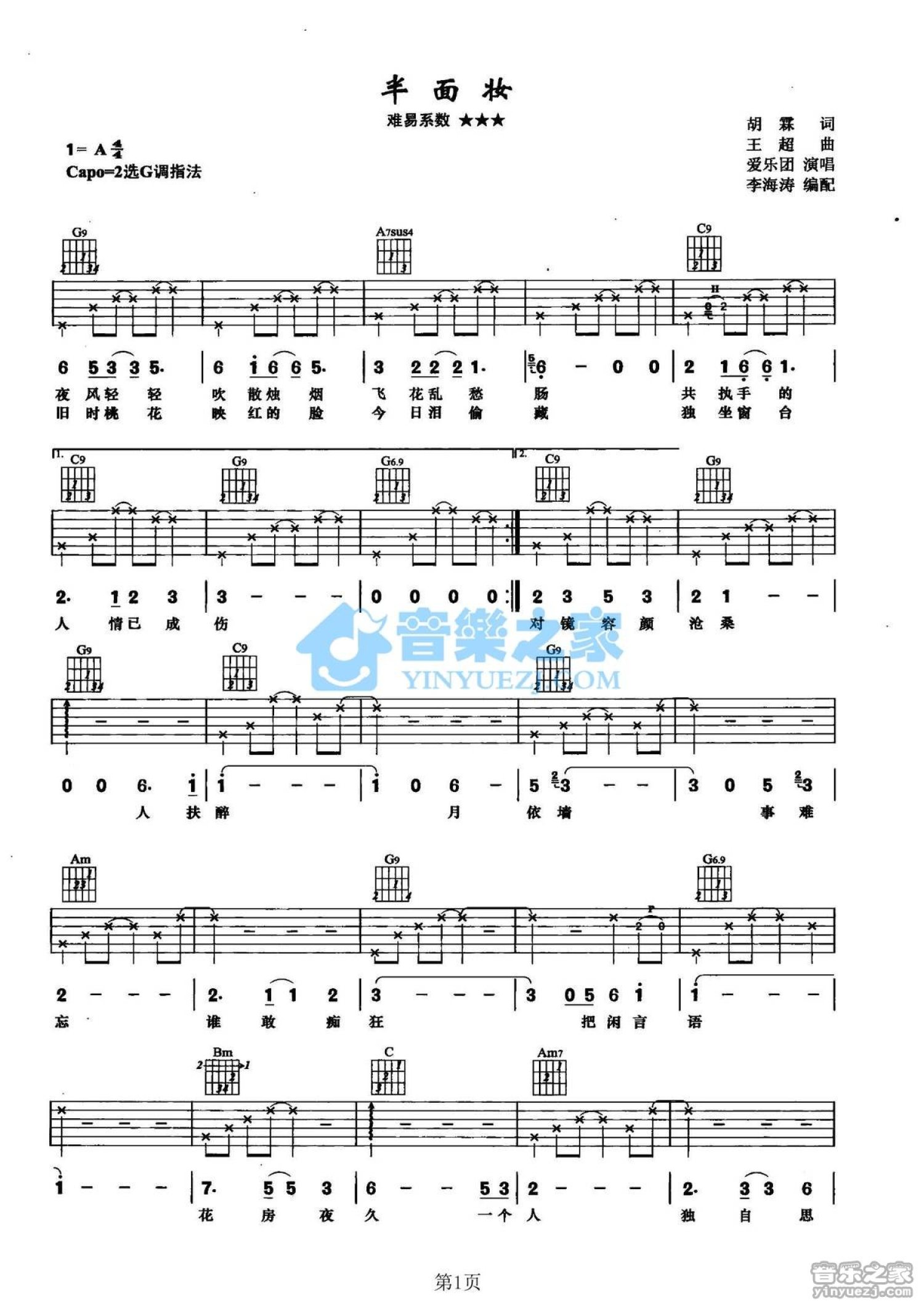 曲谱介绍: G调版爱乐团《半面妆》吉他弹唱六线谱