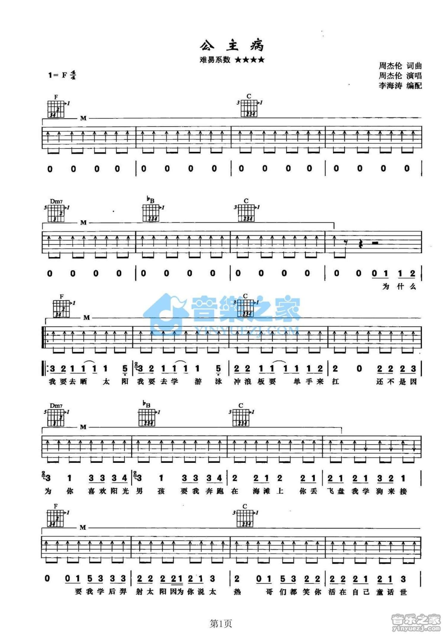 曲谱介绍: F调版周杰伦《公主病》吉他弹唱六线谱