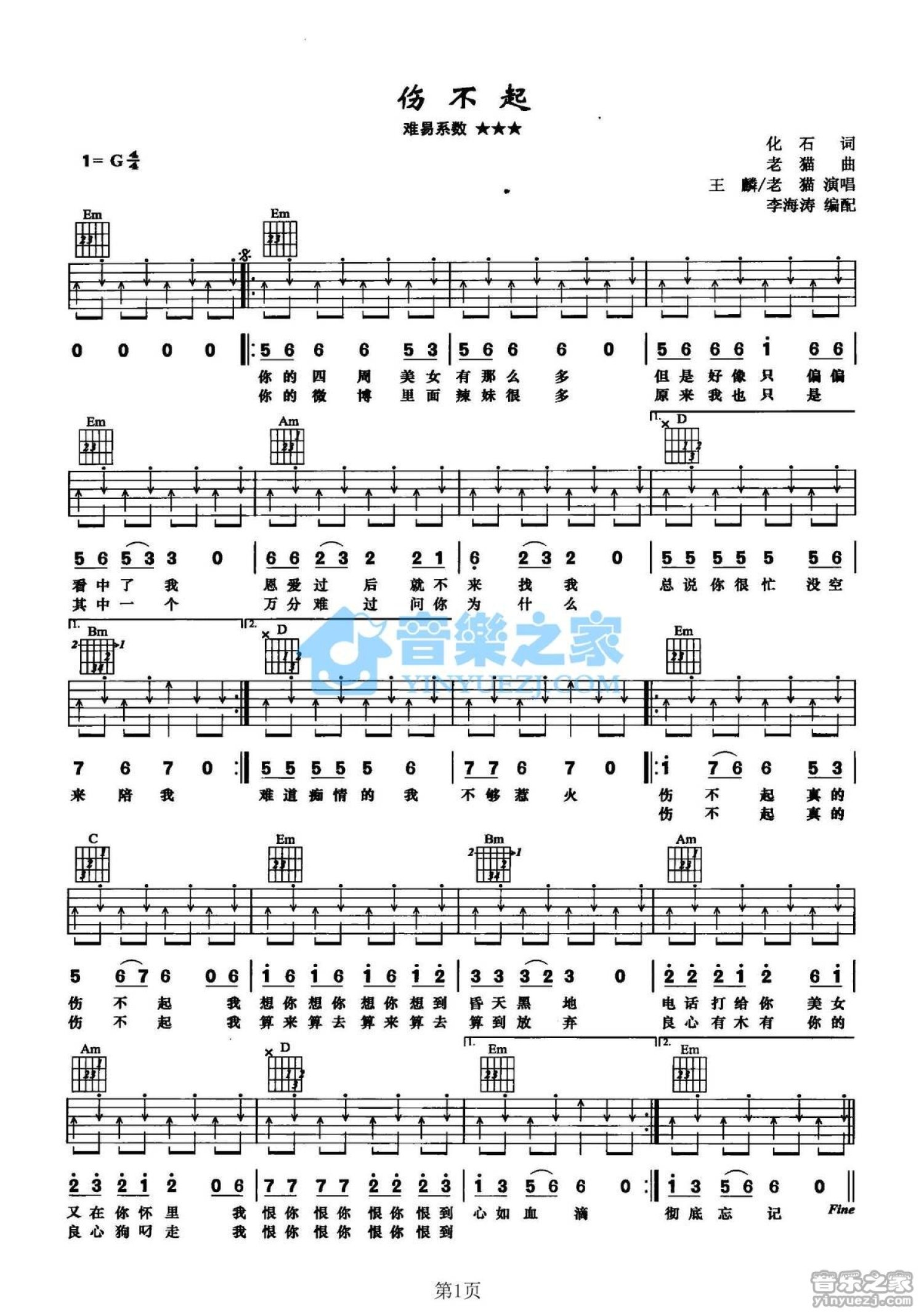 曲谱介绍: G调版《伤不起》吉他弹唱六线谱